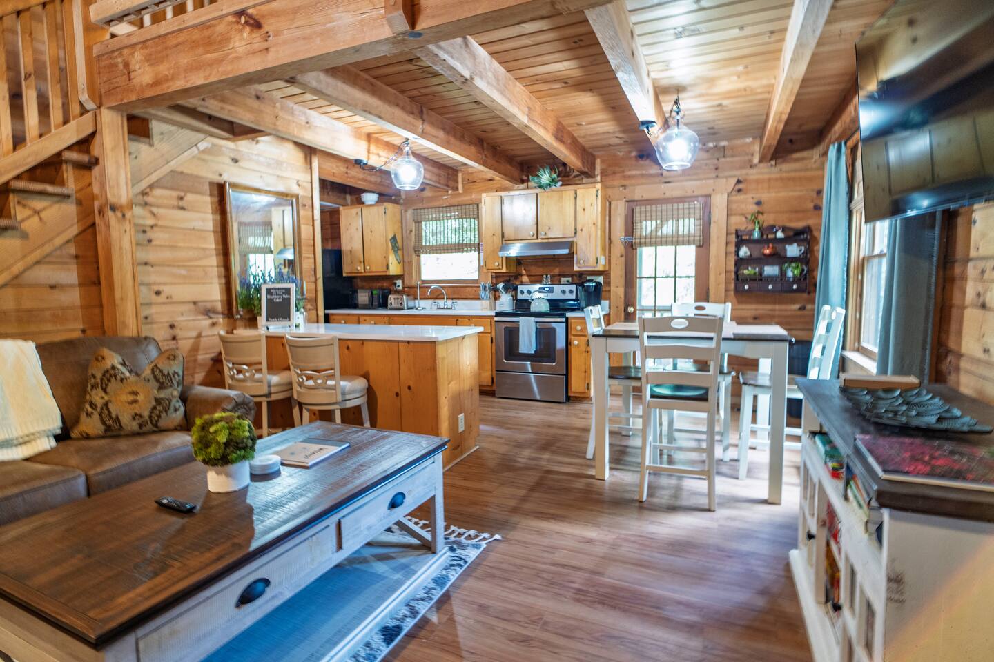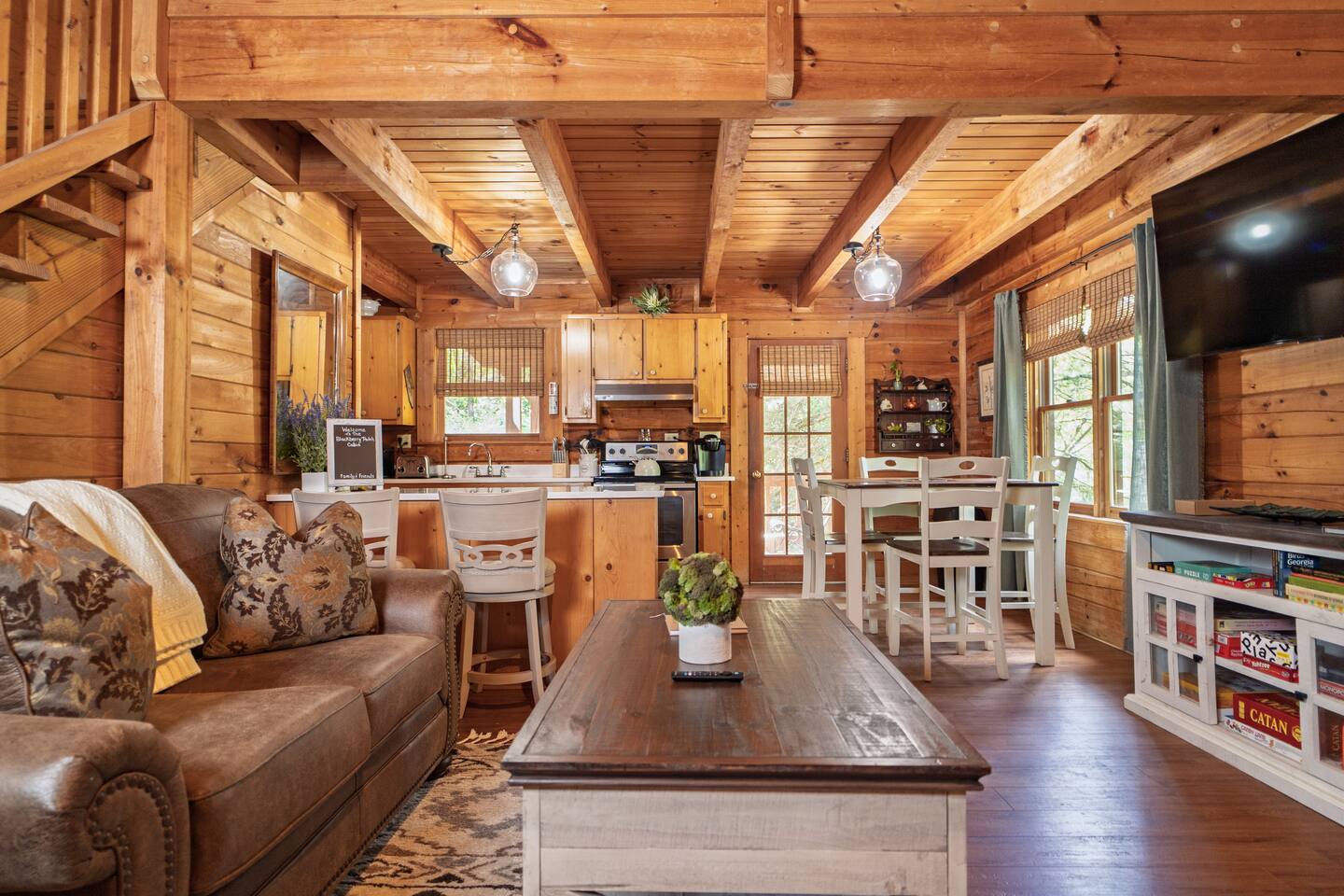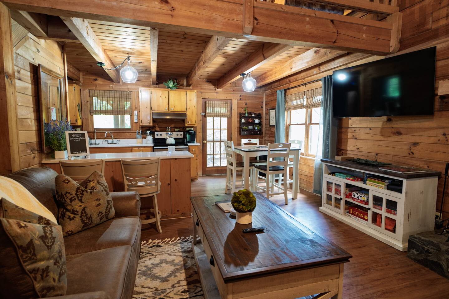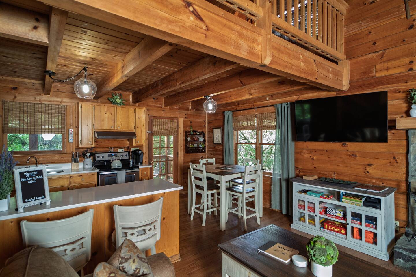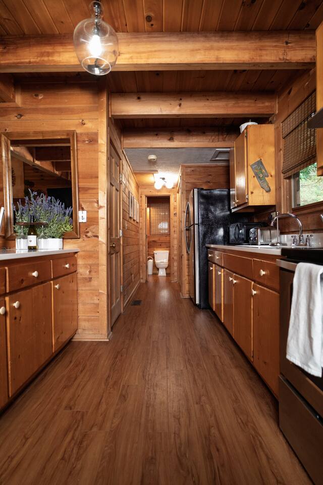 Blackberry Patch has the comforts of your own home, just bring your suitcase! Named after the blackberry bush native to the area, this high-end cabin is ready for you. Whether you're here for vacation, a quiet getaway, a wedding, or work, Blackberry Patch gives you all the amenities to make yourself feel at home. Included is a full kitchen with all the utensils and appliances for a home cooked meal, back porch for sipping your morning coffee in the KEURIG or hot cocoa anytime of year. Blackberry Patch is ready for you to come, relax, and enjoy yourself!