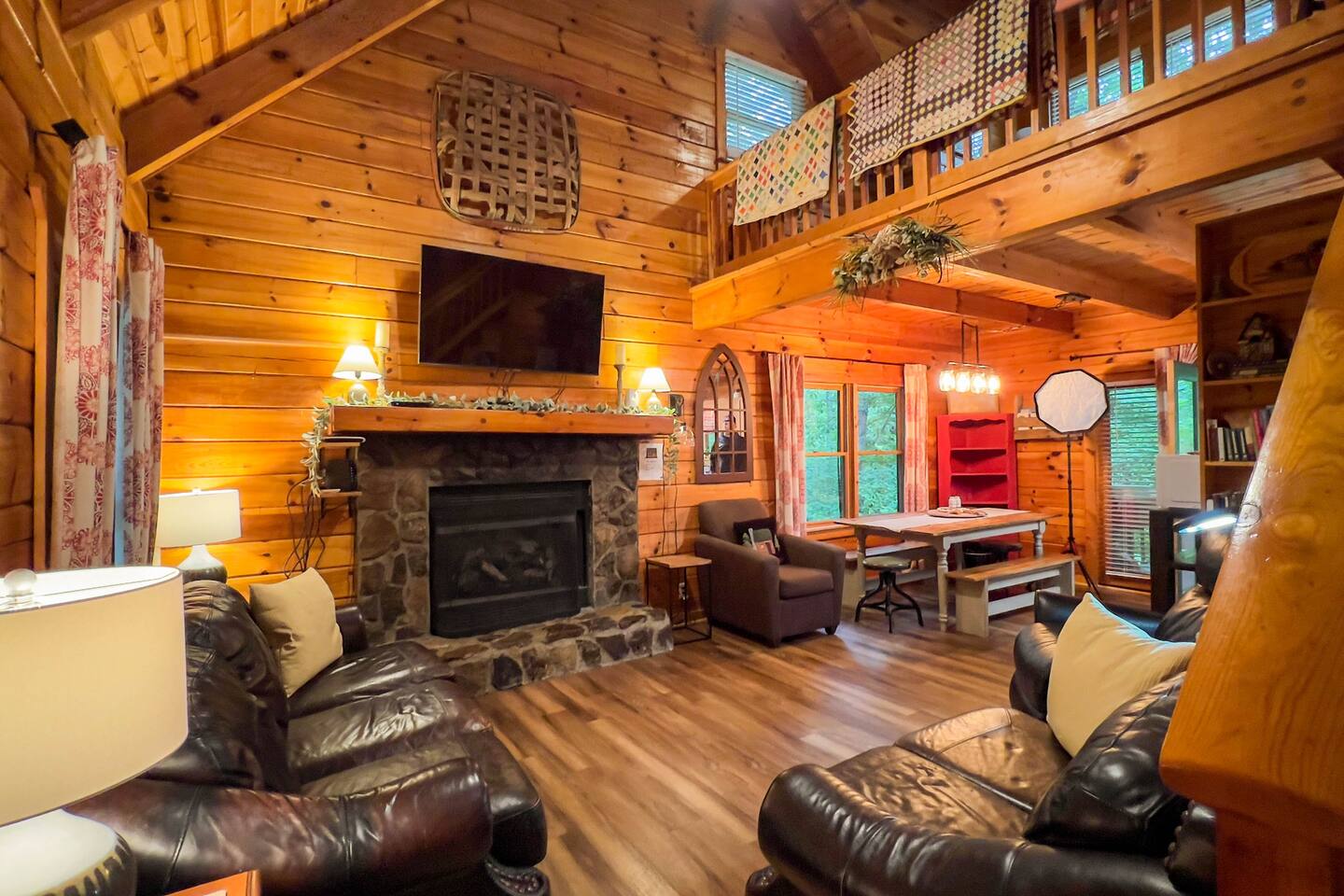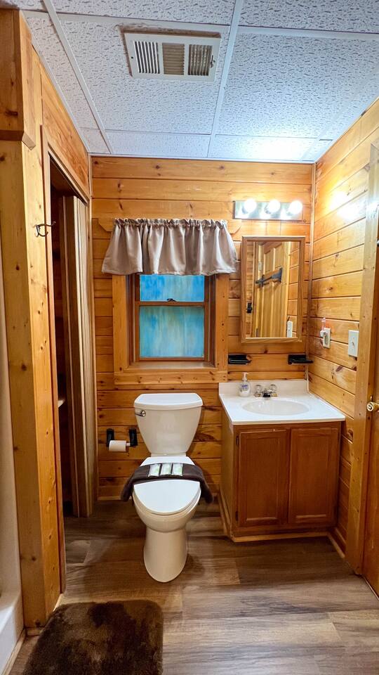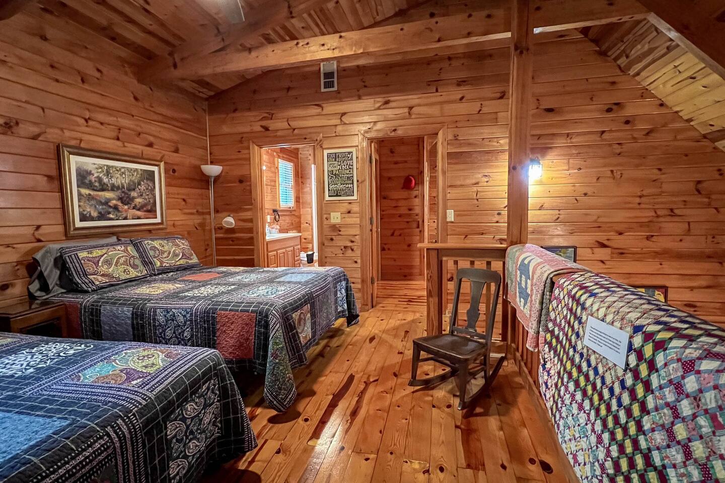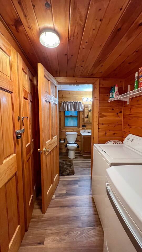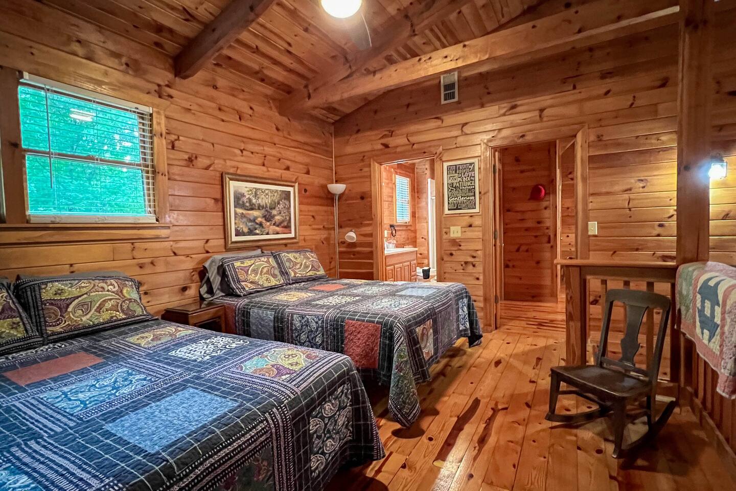 Log cabin sleeps 14 people with 3 bathrooms. Callaway Gardens is within 15 minutes from the cabin and so is the Roosevelt National historic site, “The Little White House.” Come relax on the back porch and enjoy this great vacation spot. Our cabin is perfect for families who want to spend time together. The kitchen is stocked with pots, pans, and a KEURIG. There are 2 king size beds, 4 queen sized beds and one double bed.