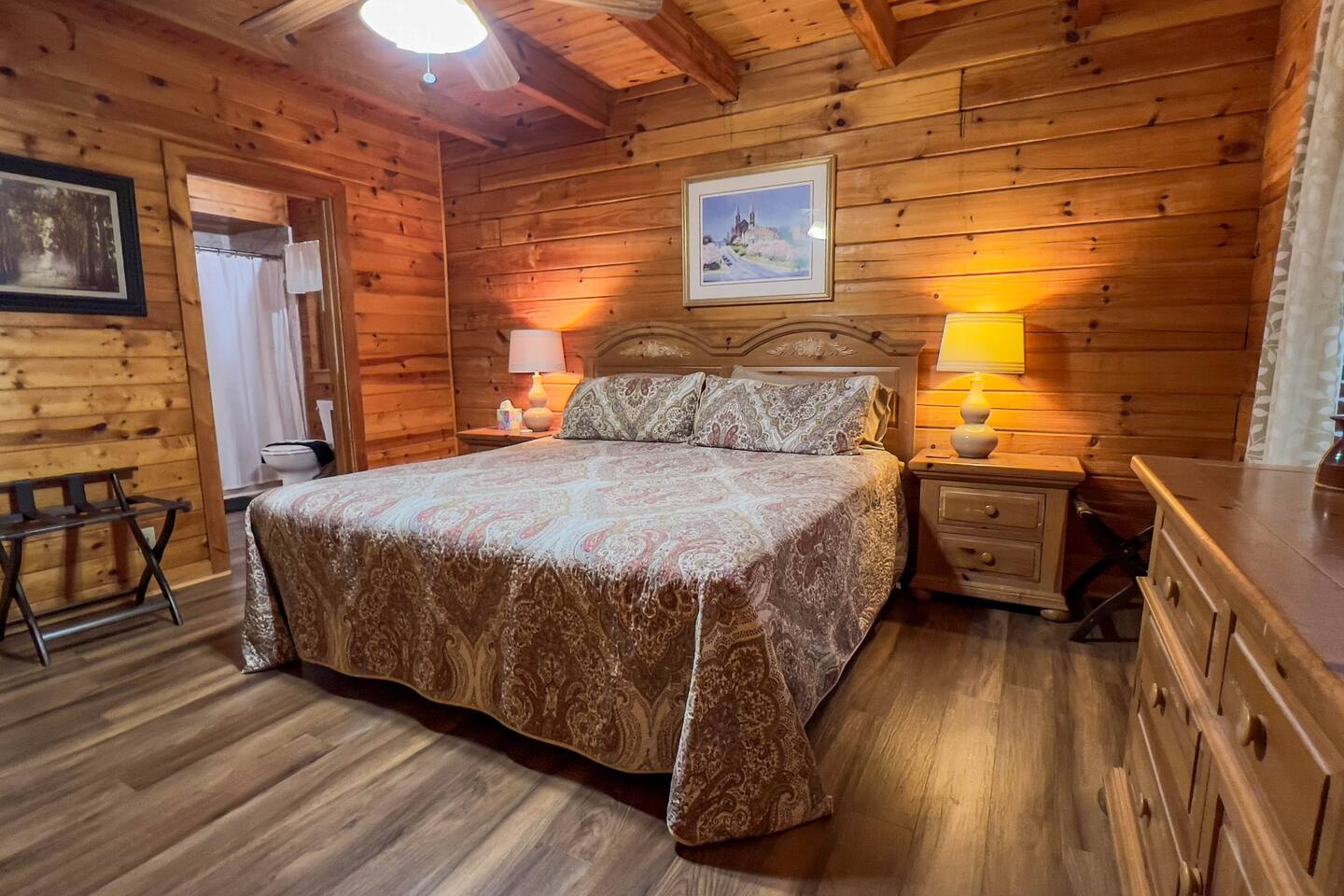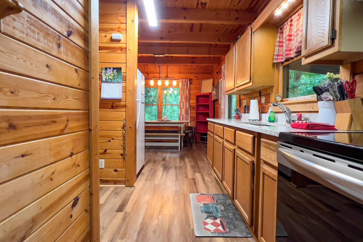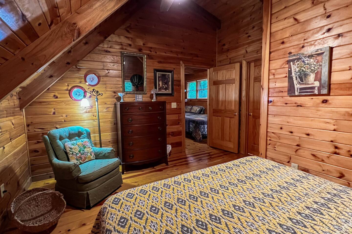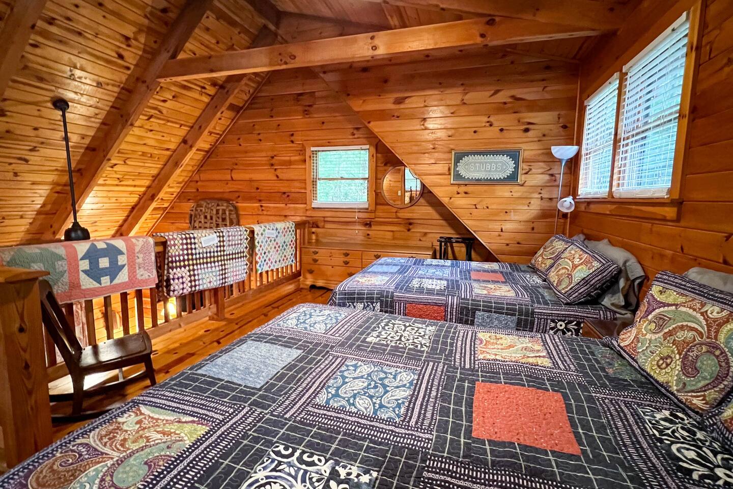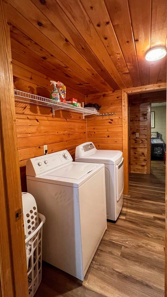 Log cabin sleeps 14 people with 3 bathrooms. Callaway Gardens is within 15 minutes from the cabin and so is the Roosevelt National historic site, “The Little White House.” Come relax on the back porch and enjoy this great vacation spot. Our cabin is perfect for families who want to spend time together. The kitchen is stocked with pots, pans, and a KEURIG. There are 2 king size beds, 4 queen sized beds and one double bed.