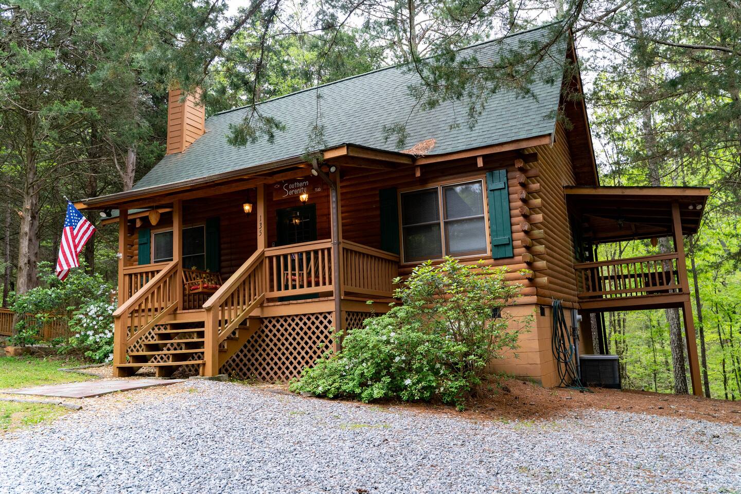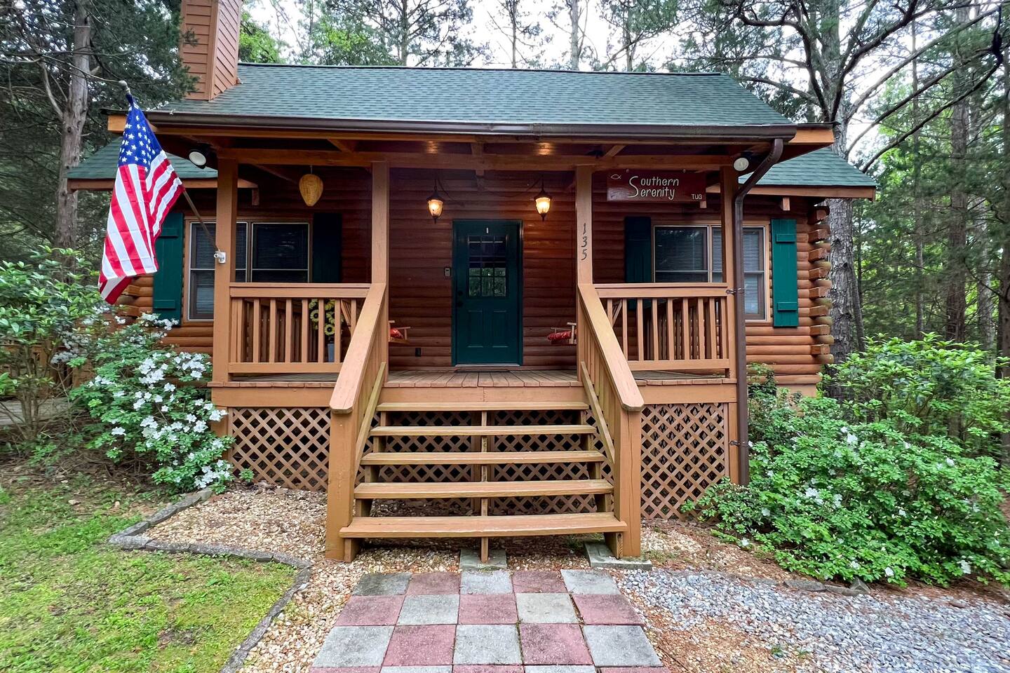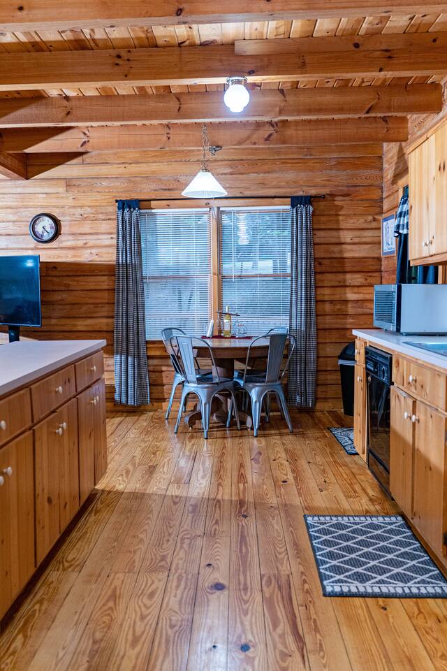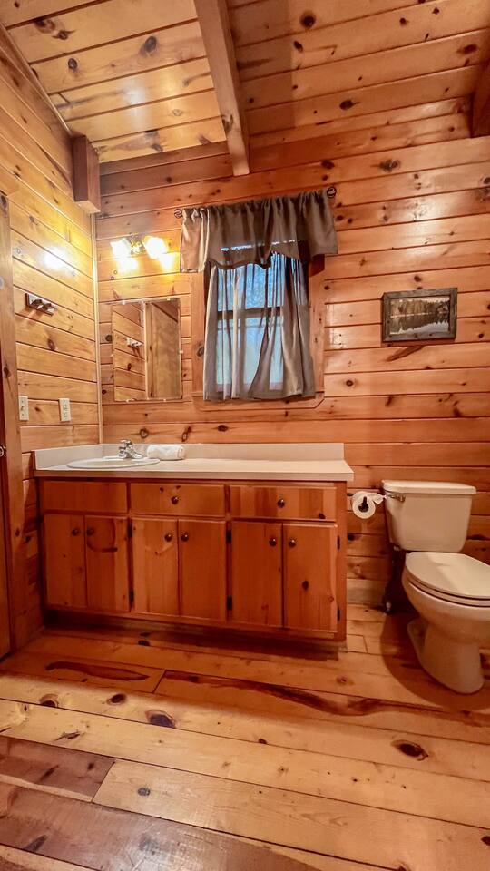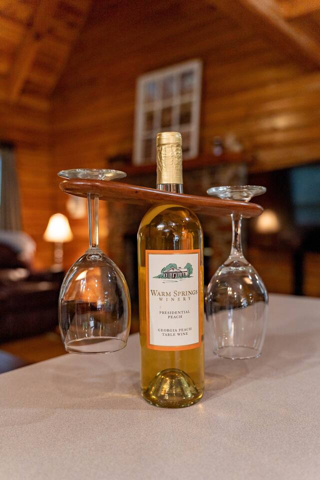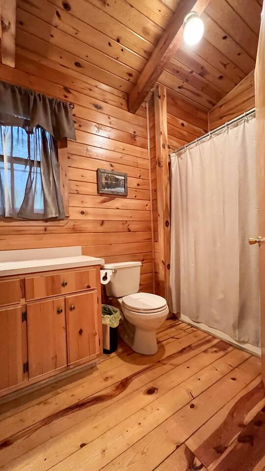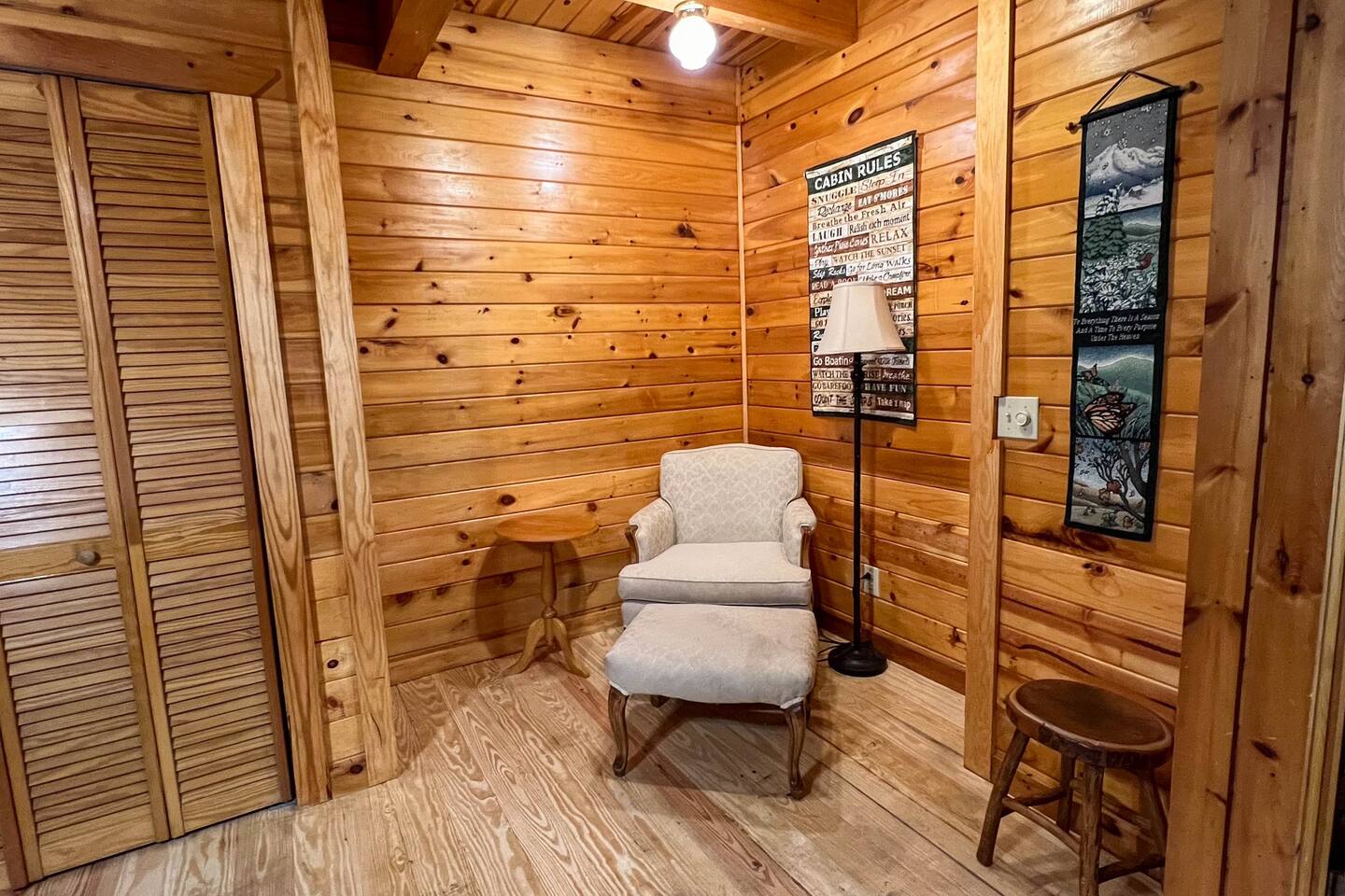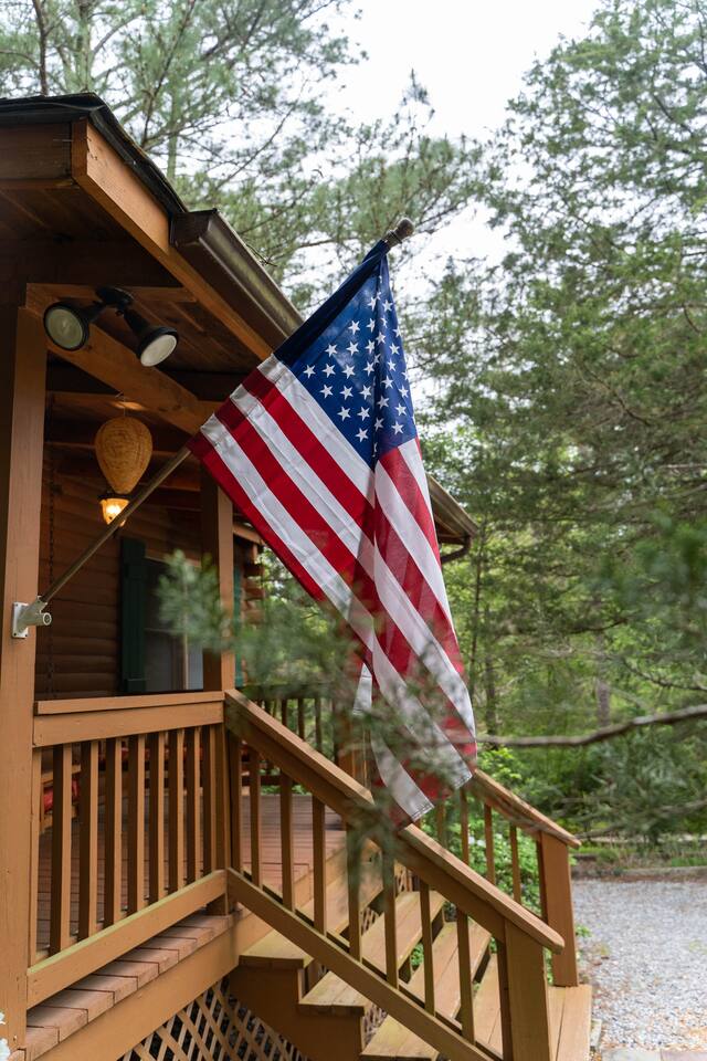 Southern Serenity – Cozy Cabin Retreat in Warm Springs, Georgia -- Escape the hustle and bustle and find your peace at Southern Serenity, a charming cabin tucked away in the serene woodlands of F. D. Roosevelt State Park, just a short drive to Callaway Gardens. Perfect for families, couples, or small groups, this pet-friendly Warm Springs vacation rental comfortably sleeps up to seven guests and offers the ideal blend of rustic charm and modern comfort. The first-floor primary bedroom is furnished with a king bed, cozy sitting nook, large closet, and adjoining bathroom. Upstairs, you’ll find an open loft with a twin-over-full bunk bed, plus a second full bath and a private bedroom with a queen bed. Sip your morning coffee or evening wine on the front porch swings as you relax, or gather on the expansive back deck with outdoor dining space, lounge chairs, and plenty of seating overlooking the peaceful wood scape. Your four-legged friends will love the fenced-in yard where they can safely play while you unwind by the outdoor firepit. Additional amenities include a wood burning fireplace, outdoor grill for cookouts, a Keurig with complimentary K-Cup pods, welcome drinks, basic cooking spices, and all the little touches to make your stay stress-free. Whether you’re here for Pumpkins at Callaway, Festival in Lights, hiking, exploring nearby downtown Pine Mountain or Warm Springs, Southern Serenity is the perfect Georgia mountain getaway to relax, recharge, and reconnect.
