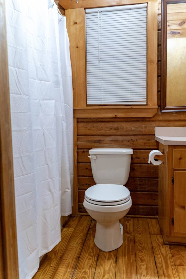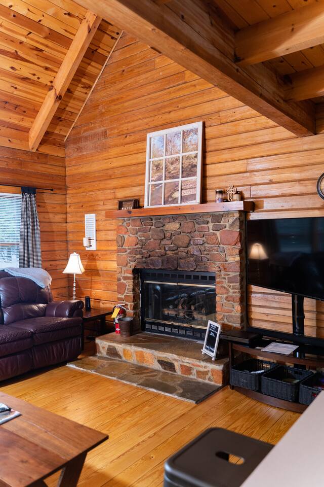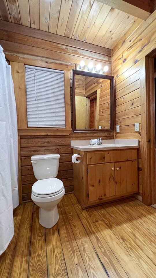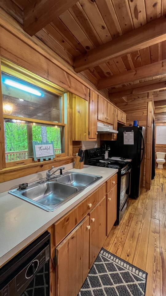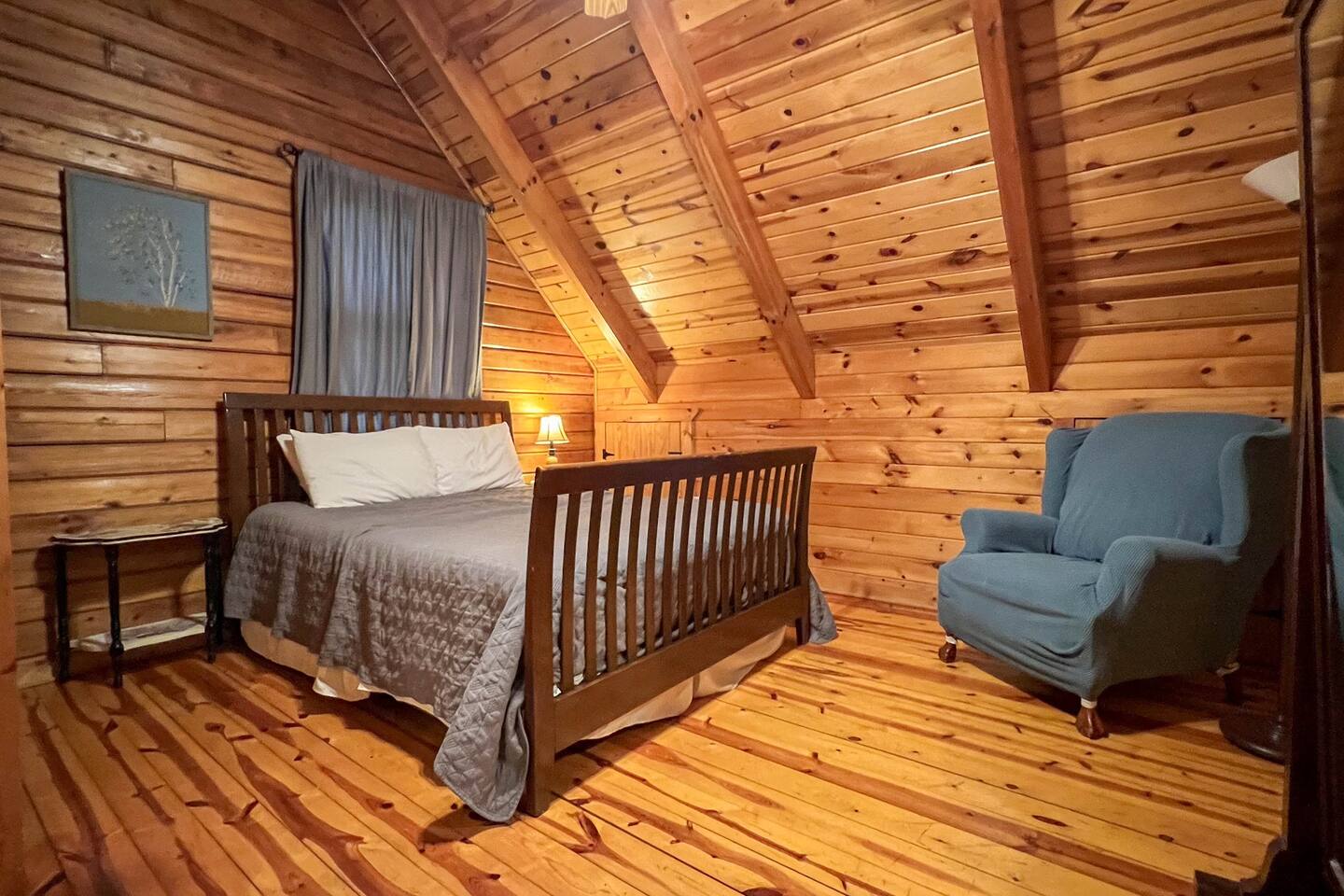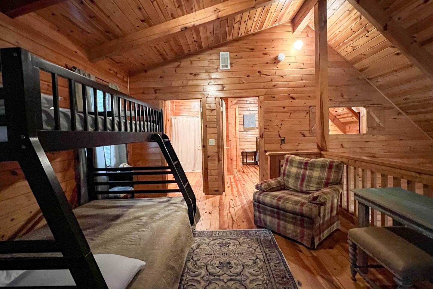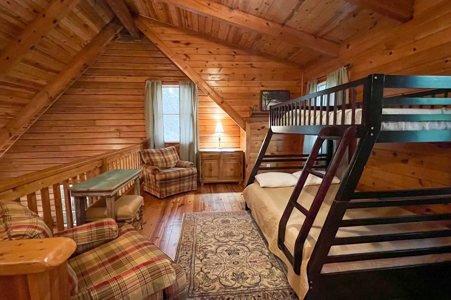 Southern Serenity – Cozy Cabin Retreat in Warm Springs, Georgia -- Escape the hustle and bustle and find your peace at Southern Serenity, a charming cabin tucked away in the serene woodlands of F. D. Roosevelt State Park, just a short drive to Callaway Gardens. Perfect for families, couples, or small groups, this pet-friendly Warm Springs vacation rental comfortably sleeps up to seven guests and offers the ideal blend of rustic charm and modern comfort. The first-floor primary bedroom is furnished with a king bed, cozy sitting nook, large closet, and adjoining bathroom. Upstairs, you’ll find an open loft with a twin-over-full bunk bed, plus a second full bath and a private bedroom with a queen bed. Sip your morning coffee or evening wine on the front porch swings as you relax, or gather on the expansive back deck with outdoor dining space, lounge chairs, and plenty of seating overlooking the peaceful wood scape. Your four-legged friends will love the fenced-in yard where they can safely play while you unwind by the outdoor firepit. Additional amenities include a wood burning fireplace, outdoor grill for cookouts, a Keurig with complimentary K-Cup pods, welcome drinks, basic cooking spices, and all the little touches to make your stay stress-free. Whether you’re here for Pumpkins at Callaway, Festival in Lights, hiking, exploring nearby downtown Pine Mountain or Warm Springs, Southern Serenity is the perfect Georgia mountain getaway to relax, recharge, and reconnect.