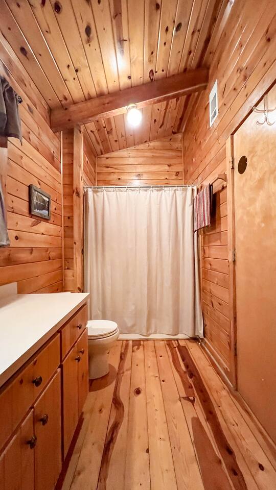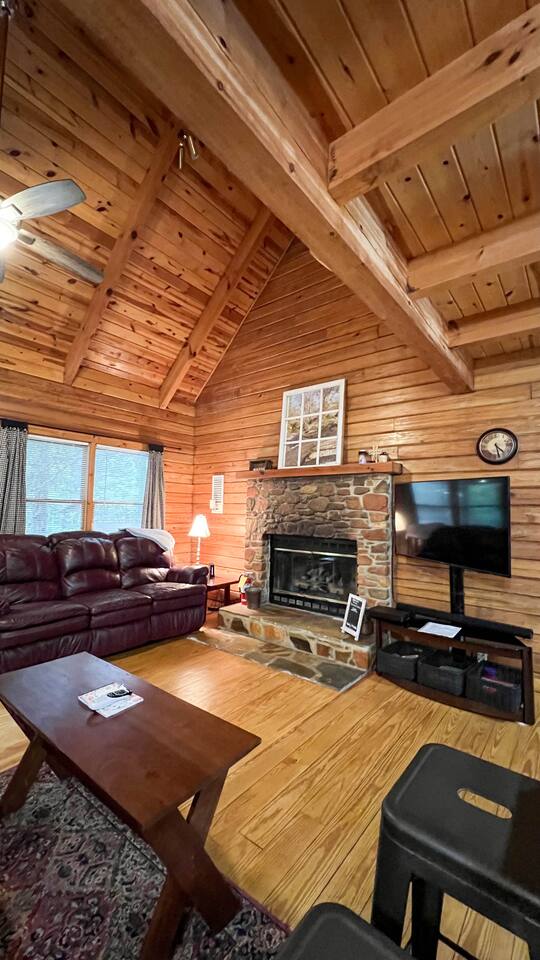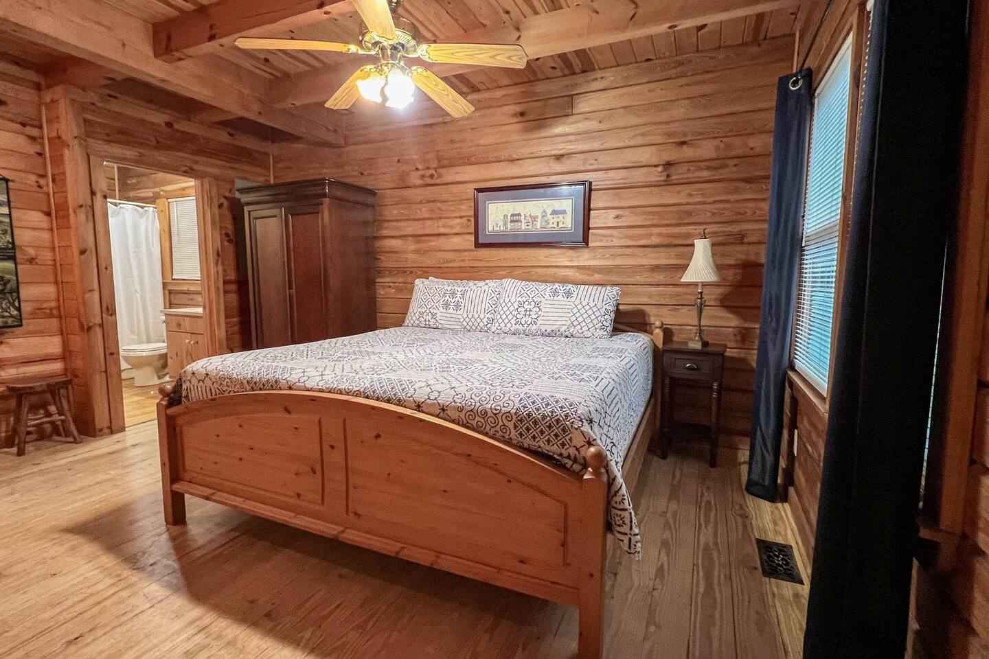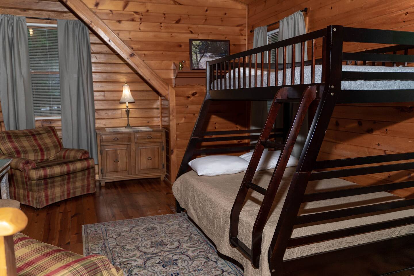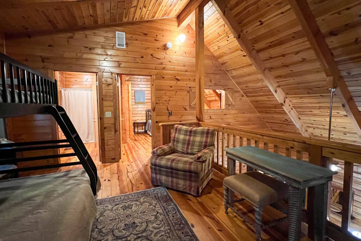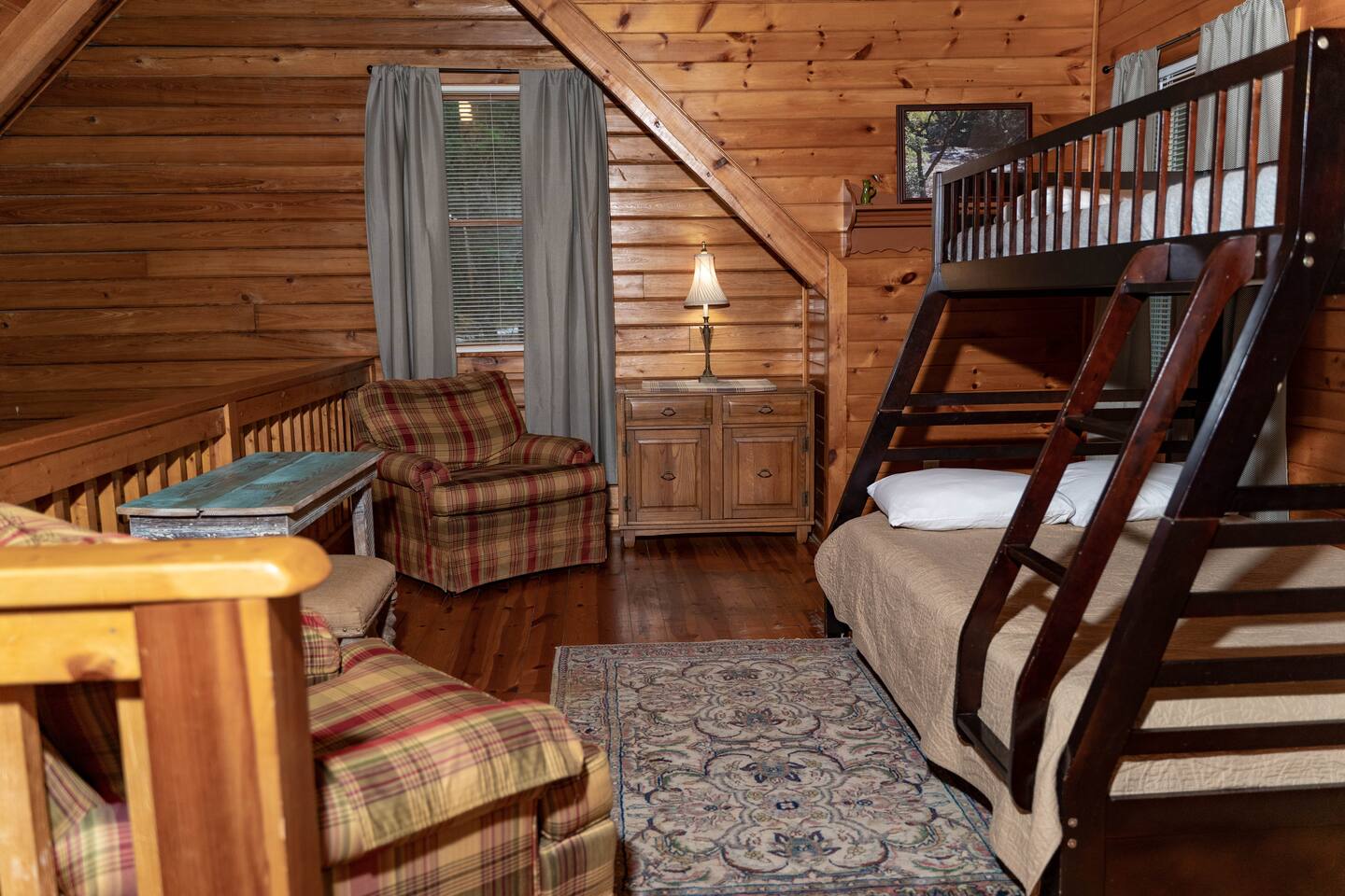 Southern Serenity – Cozy Cabin Retreat in Warm Springs, Georgia -- Escape the hustle and bustle and find your peace at Southern Serenity, a charming cabin tucked away in the serene woodlands of F. D. Roosevelt State Park, just a short drive to Callaway Gardens. Perfect for families, couples, or small groups, this pet-friendly Warm Springs vacation rental comfortably sleeps up to seven guests and offers the ideal blend of rustic charm and modern comfort. The first-floor primary bedroom is furnished with a king bed, cozy sitting nook, large closet, and adjoining bathroom. Upstairs, you’ll find an open loft with a twin-over-full bunk bed, plus a second full bath and a private bedroom with a queen bed. Sip your morning coffee or evening wine on the front porch swings as you relax, or gather on the expansive back deck with outdoor dining space, lounge chairs, and plenty of seating overlooking the peaceful wood scape. Your four-legged friends will love the fenced-in yard where they can safely play while you unwind by the outdoor firepit. Additional amenities include a wood burning fireplace, outdoor grill for cookouts, a Keurig with complimentary K-Cup pods, welcome drinks, basic cooking spices, and all the little touches to make your stay stress-free. Whether you’re here for Pumpkins at Callaway, Festival in Lights, hiking, exploring nearby downtown Pine Mountain or Warm Springs, Southern Serenity is the perfect Georgia mountain getaway to relax, recharge, and reconnect.