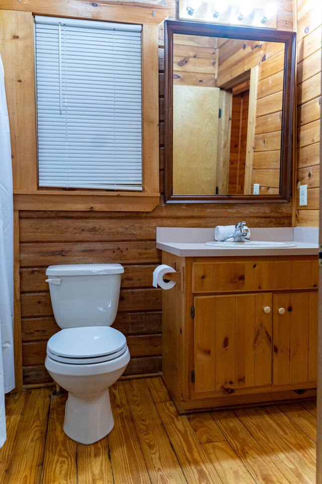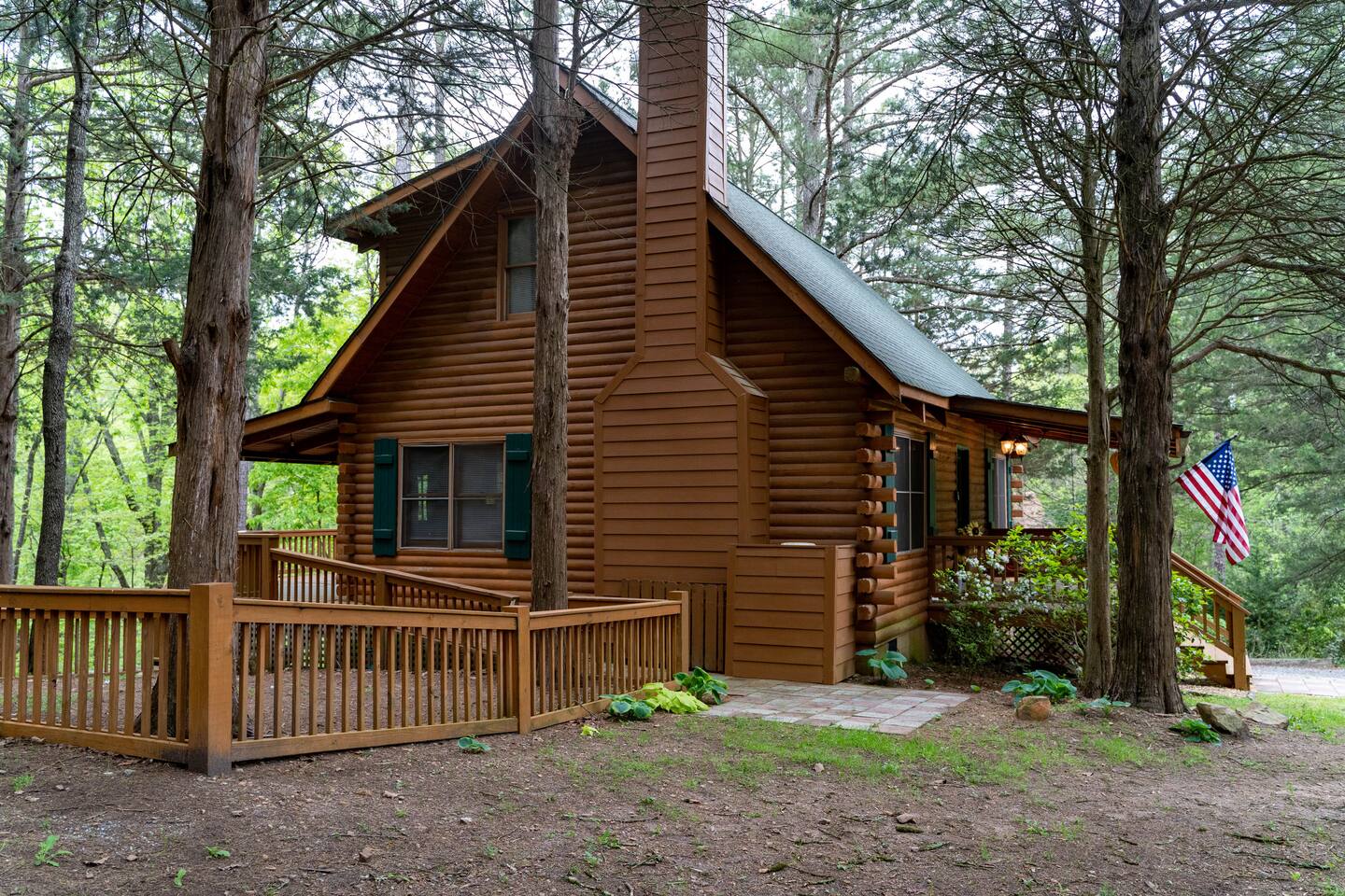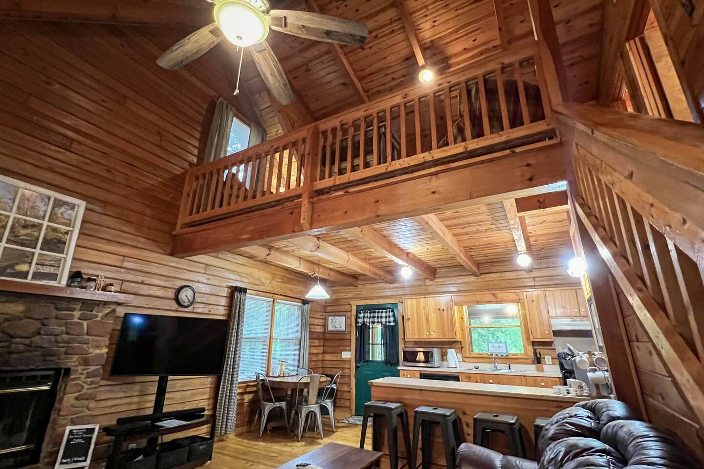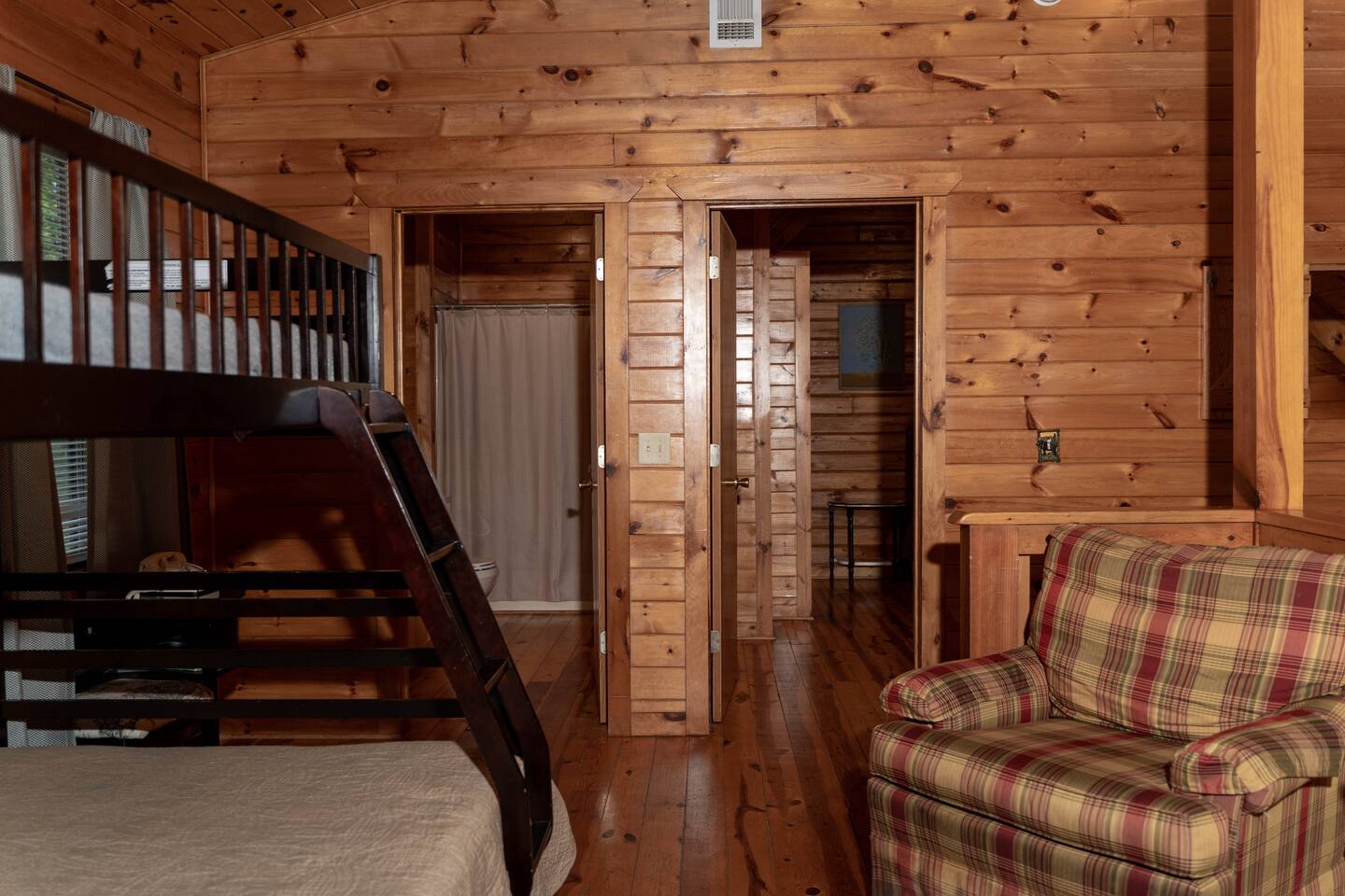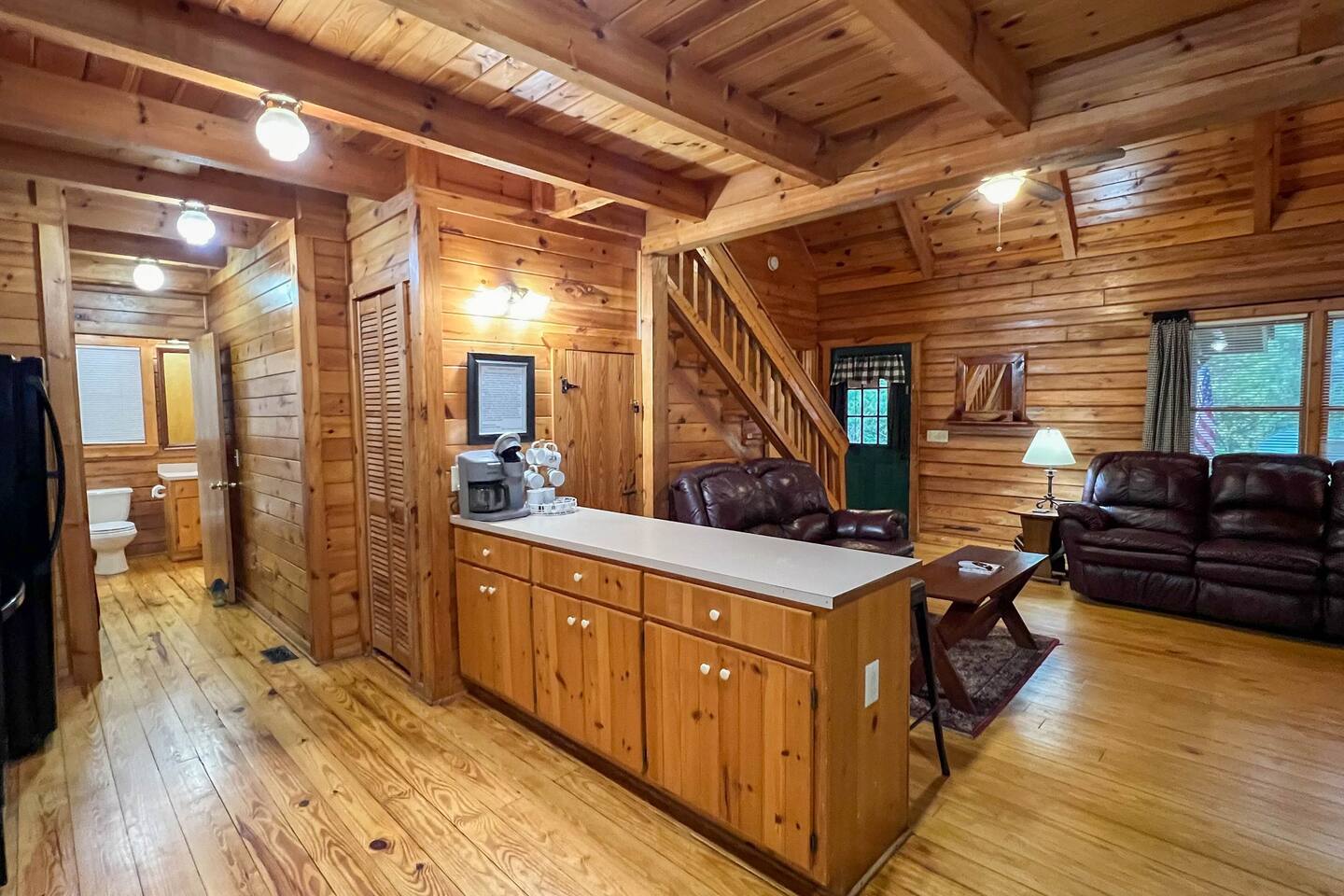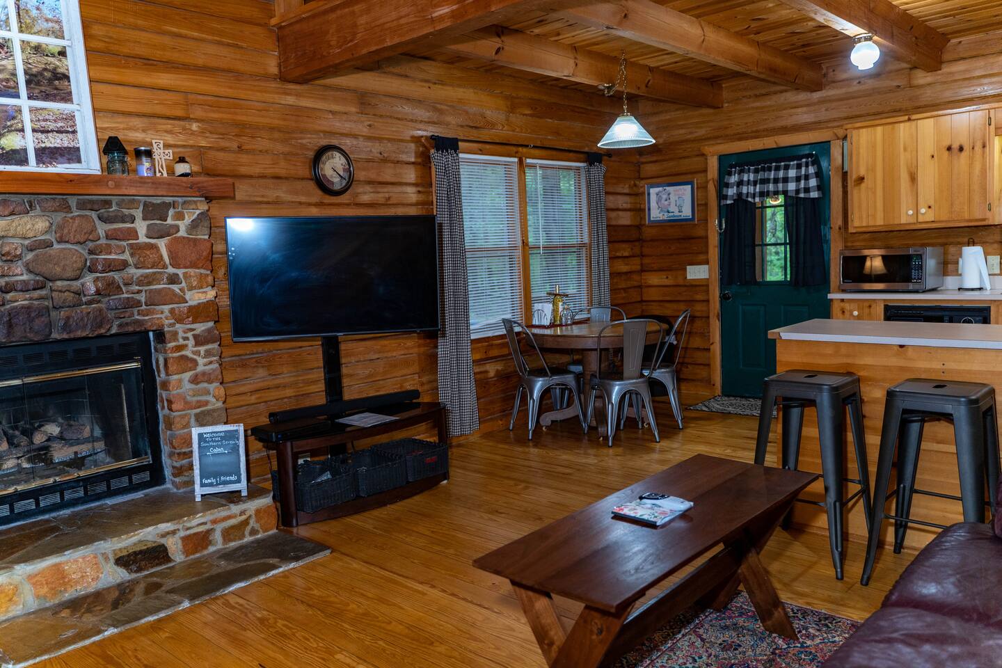 Southern Serenity – Cozy Cabin Retreat in Warm Springs, Georgia -- Escape the hustle and bustle and find your peace at Southern Serenity, a charming cabin tucked away in the serene woodlands of F. D. Roosevelt State Park, just a short drive to Callaway Gardens. Perfect for families, couples, or small groups, this pet-friendly Warm Springs vacation rental comfortably sleeps up to seven guests and offers the ideal blend of rustic charm and modern comfort. The first-floor primary bedroom is furnished with a king bed, cozy sitting nook, large closet, and adjoining bathroom. Upstairs, you’ll find an open loft with a twin-over-full bunk bed, plus a second full bath and a private bedroom with a queen bed. Sip your morning coffee or evening wine on the front porch swings as you relax, or gather on the expansive back deck with outdoor dining space, lounge chairs, and plenty of seating overlooking the peaceful wood scape. Your four-legged friends will love the fenced-in yard where they can safely play while you unwind by the outdoor firepit. Additional amenities include a wood burning fireplace, outdoor grill for cookouts, a Keurig with complimentary K-Cup pods, welcome drinks, basic cooking spices, and all the little touches to make your stay stress-free. Whether you’re here for Pumpkins at Callaway, Festival in Lights, hiking, exploring nearby downtown Pine Mountain or Warm Springs, Southern Serenity is the perfect Georgia mountain getaway to relax, recharge, and reconnect.