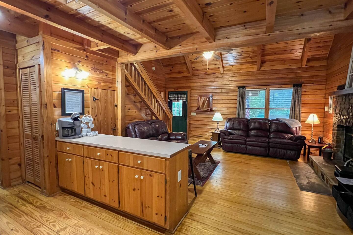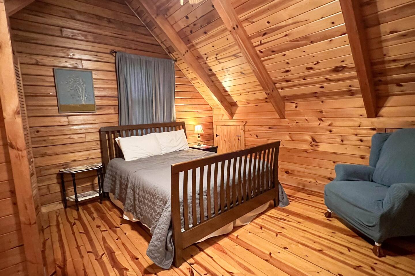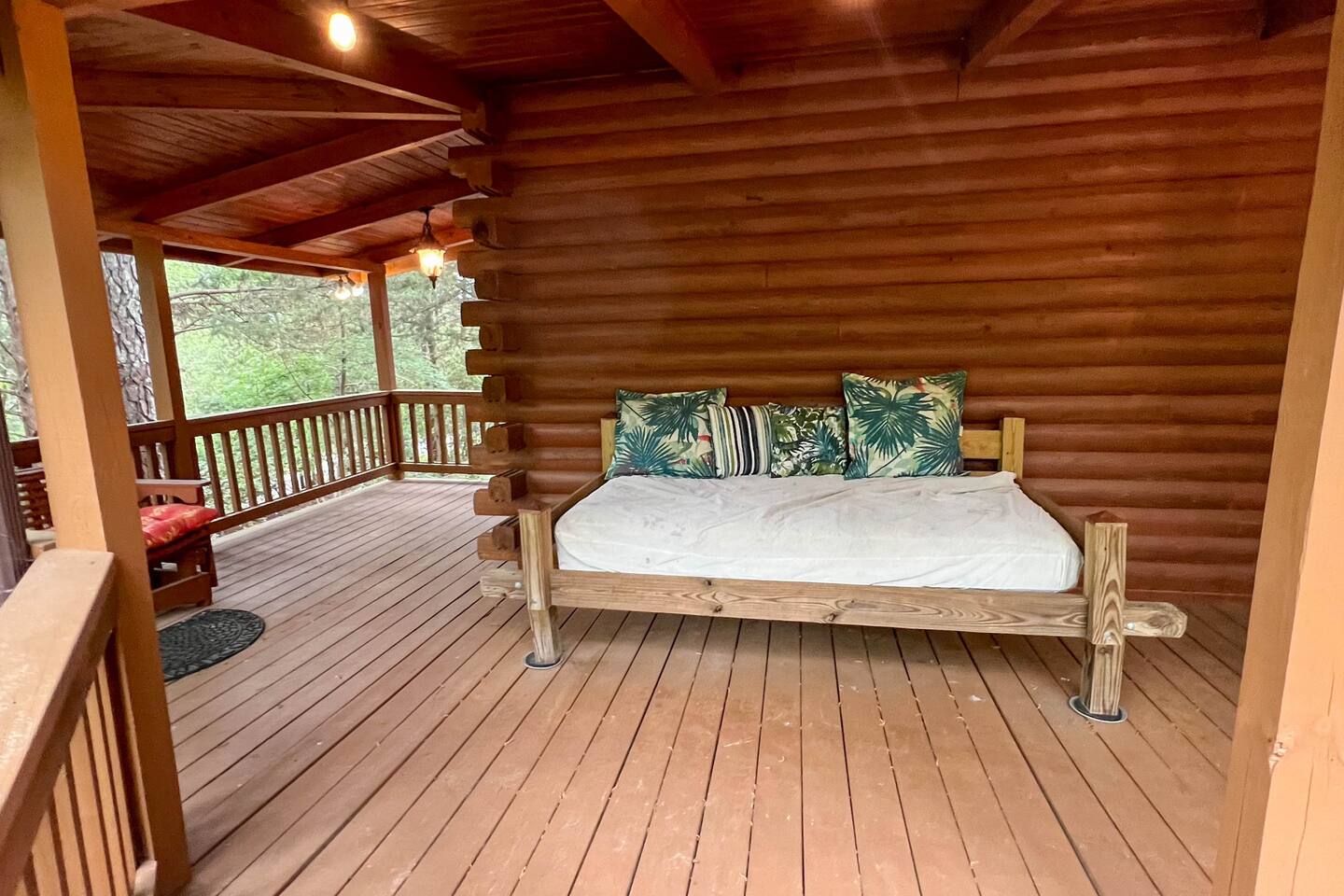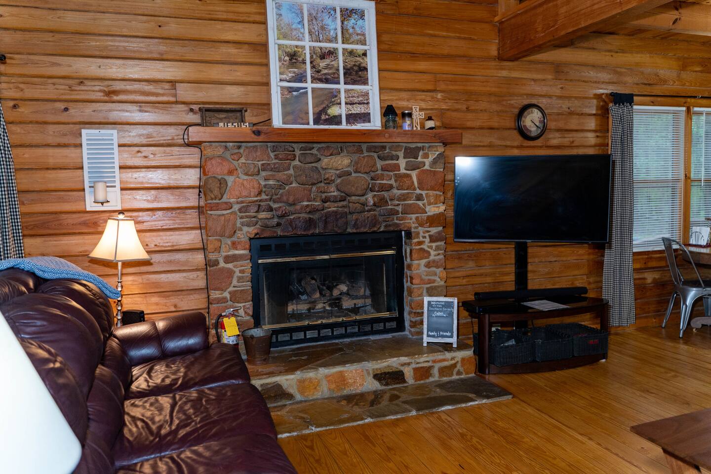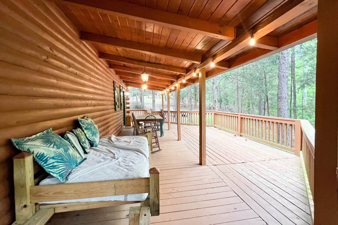Southern Serenity – Cozy Cabin Retreat in Warm Springs, Georgia -- Escape the hustle and bustle and find your peace at Southern Serenity, a charming cabin tucked away in the serene woodlands of F. D. Roosevelt State Park, just a short drive to Callaway Gardens. Perfect for families, couples, or small groups, this pet-friendly Warm Springs vacation rental comfortably sleeps up to seven guests and offers the ideal blend of rustic charm and modern comfort. The first-floor primary bedroom is furnished with a king bed, cozy sitting nook, large closet, and adjoining bathroom. Upstairs, you’ll find an open loft with a twin-over-full bunk bed, plus a second full bath and a private bedroom with a queen bed. Sip your morning coffee or evening wine on the front porch swings as you relax, or gather on the expansive back deck with outdoor dining space, lounge chairs, and plenty of seating overlooking the peaceful wood scape. Your four-legged friends will love the fenced-in yard where they can safely play while you unwind by the outdoor firepit. Additional amenities include a wood burning fireplace, outdoor grill for cookouts, a Keurig with complimentary K-Cup pods, welcome drinks, basic cooking spices, and all the little touches to make your stay stress-free. Whether you’re here for Pumpkins at Callaway, Festival in Lights, hiking, exploring nearby downtown Pine Mountain or Warm Springs, Southern Serenity is the perfect Georgia mountain getaway to relax, recharge, and reconnect.