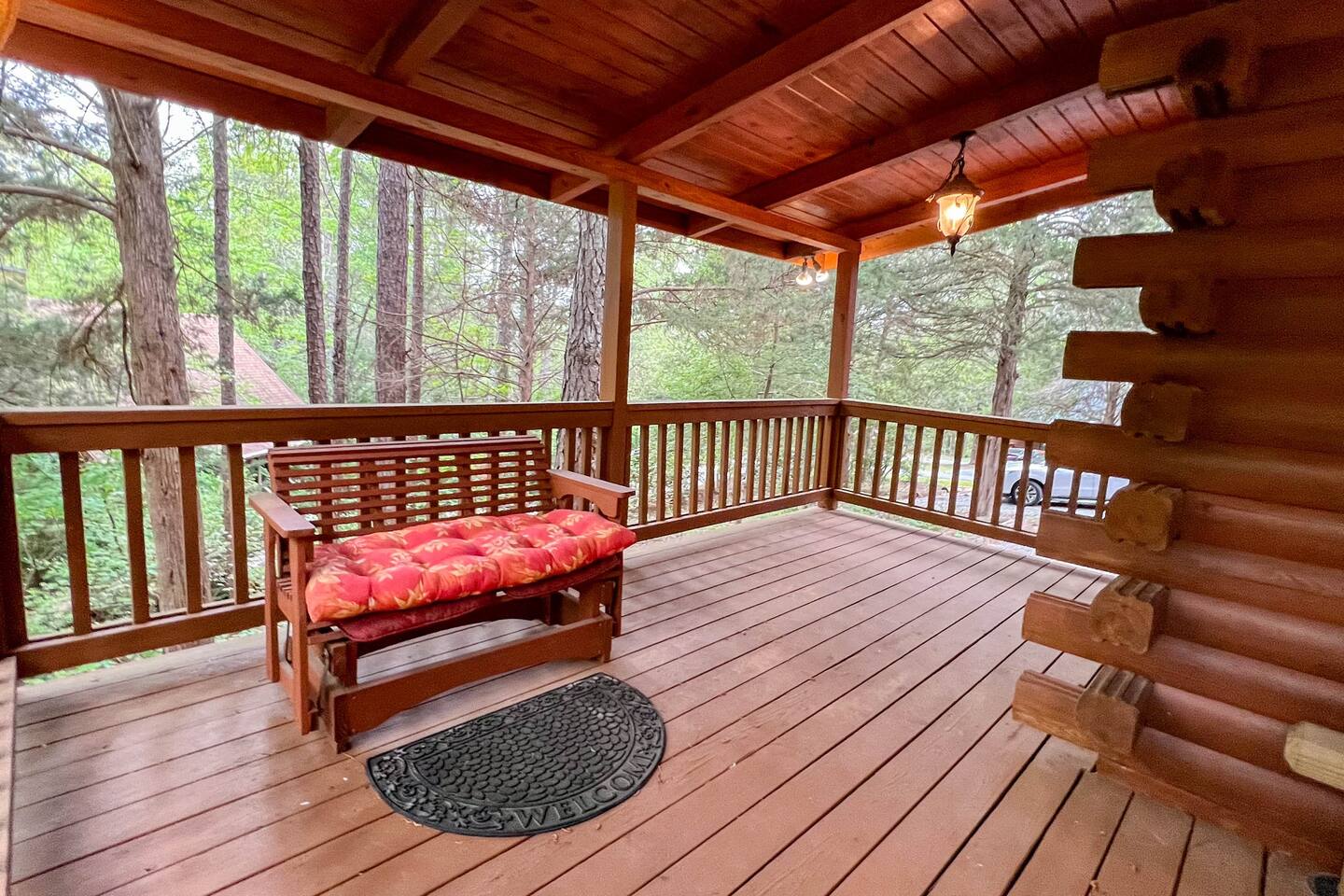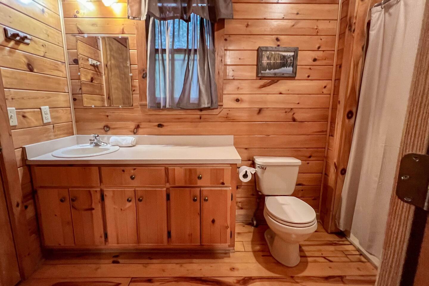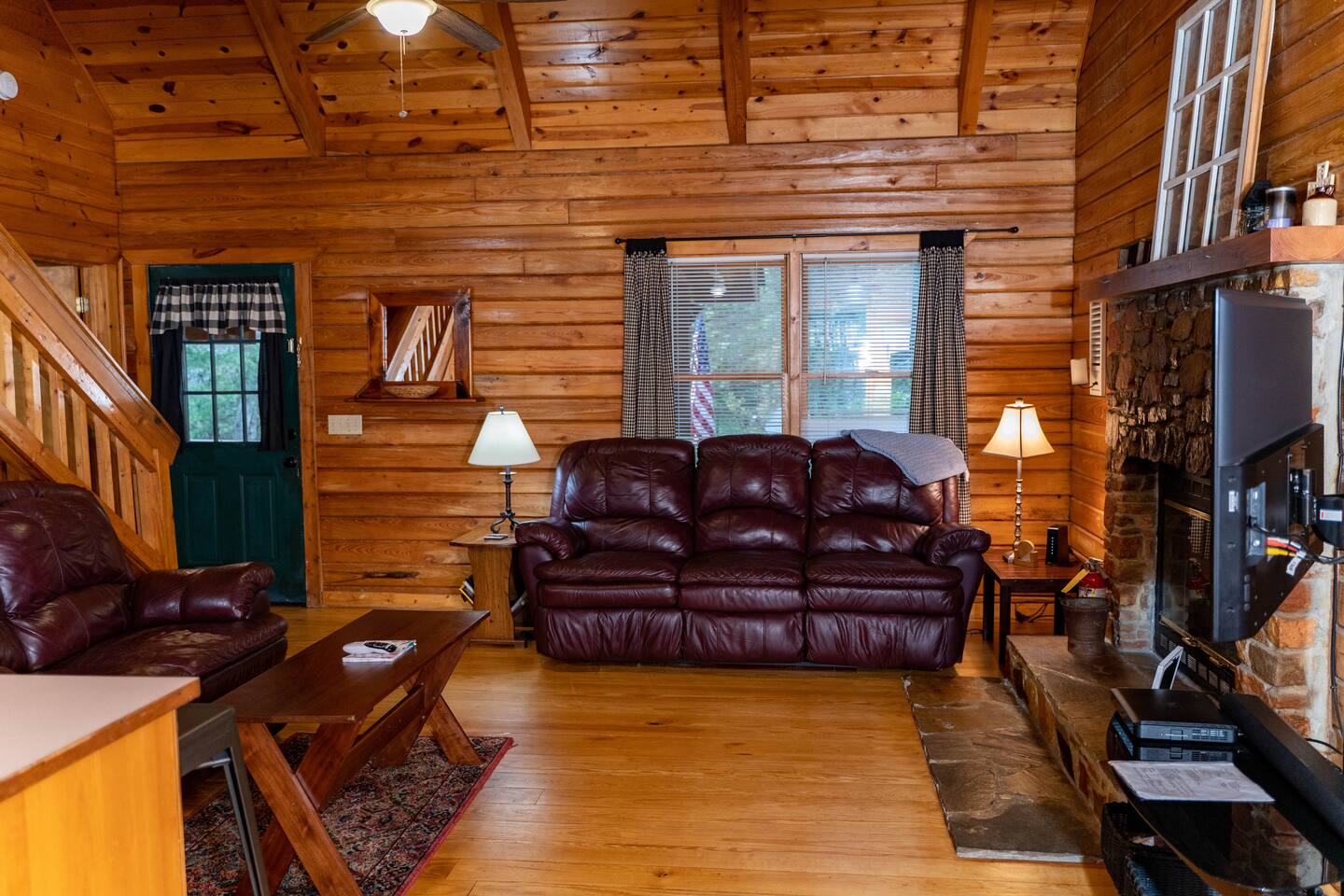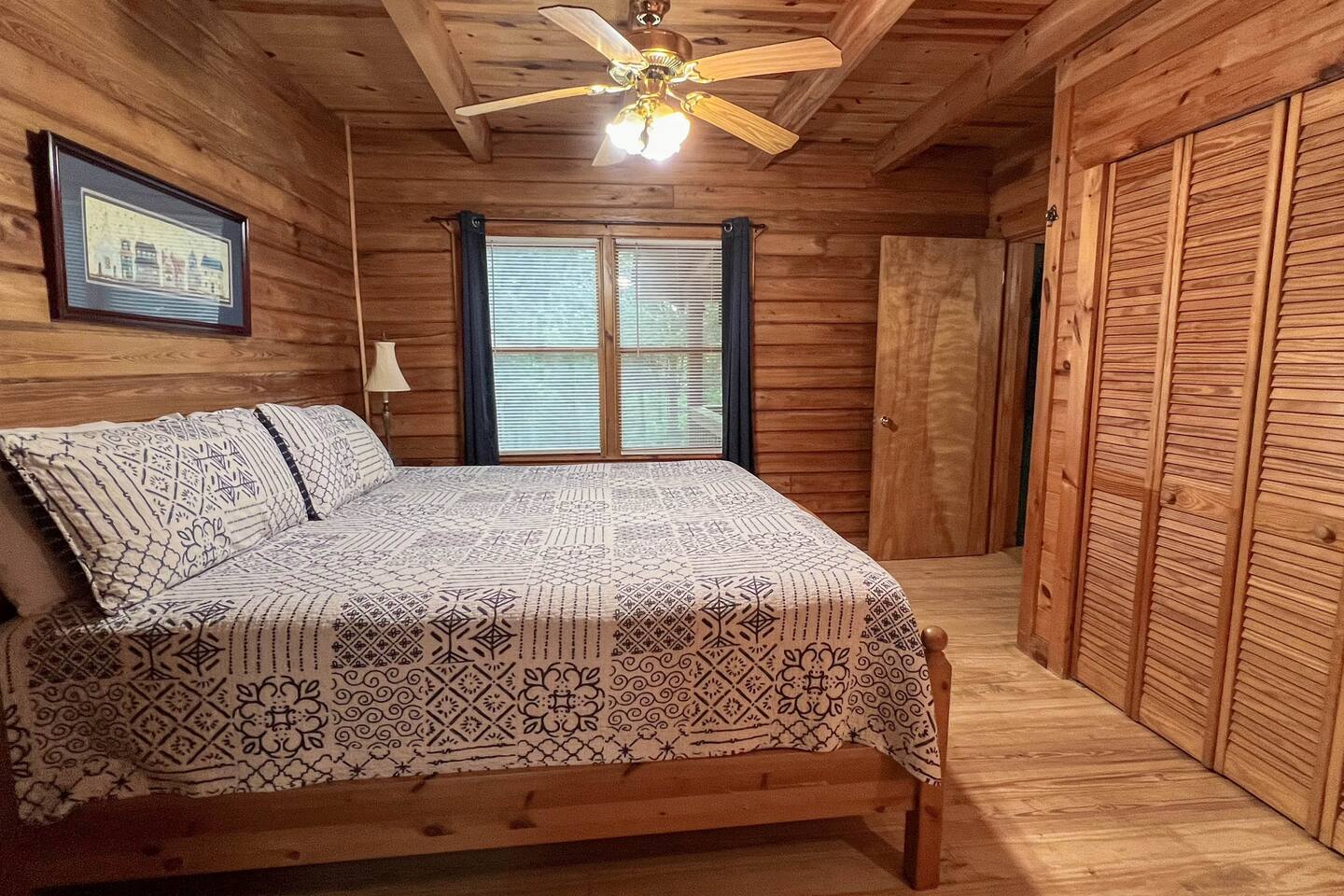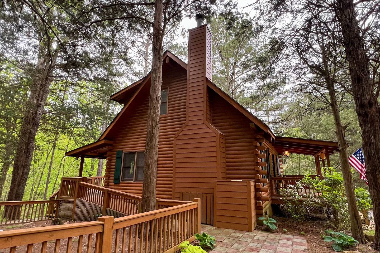 Southern Serenity – Cozy Cabin Retreat in Warm Springs, Georgia -- Escape the hustle and bustle and find your peace at Southern Serenity, a charming cabin tucked away in the serene woodlands of F. D. Roosevelt State Park, just a short drive to Callaway Gardens. Perfect for families, couples, or small groups, this pet-friendly Warm Springs vacation rental comfortably sleeps up to seven guests and offers the ideal blend of rustic charm and modern comfort. The first-floor primary bedroom is furnished with a king bed, cozy sitting nook, large closet, and adjoining bathroom. Upstairs, you’ll find an open loft with a twin-over-full bunk bed, plus a second full bath and a private bedroom with a queen bed. Sip your morning coffee or evening wine on the front porch swings as you relax, or gather on the expansive back deck with outdoor dining space, lounge chairs, and plenty of seating overlooking the peaceful wood scape. Your four-legged friends will love the fenced-in yard where they can safely play while you unwind by the outdoor firepit. Additional amenities include a wood burning fireplace, outdoor grill for cookouts, a Keurig with complimentary K-Cup pods, welcome drinks, basic cooking spices, and all the little touches to make your stay stress-free. Whether you’re here for Pumpkins at Callaway, Festival in Lights, hiking, exploring nearby downtown Pine Mountain or Warm Springs, Southern Serenity is the perfect Georgia mountain getaway to relax, recharge, and reconnect.