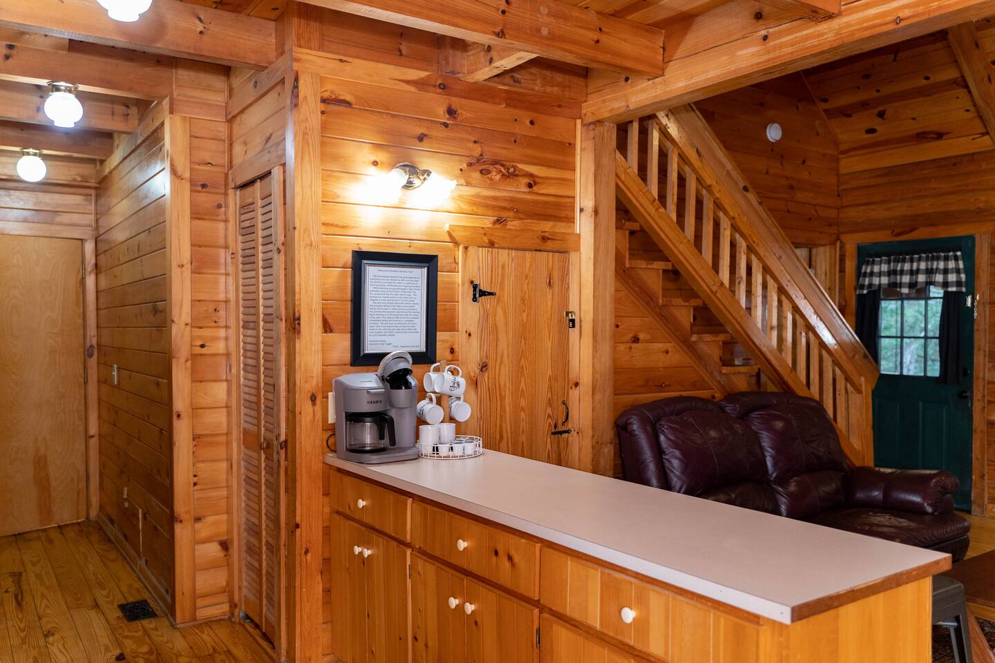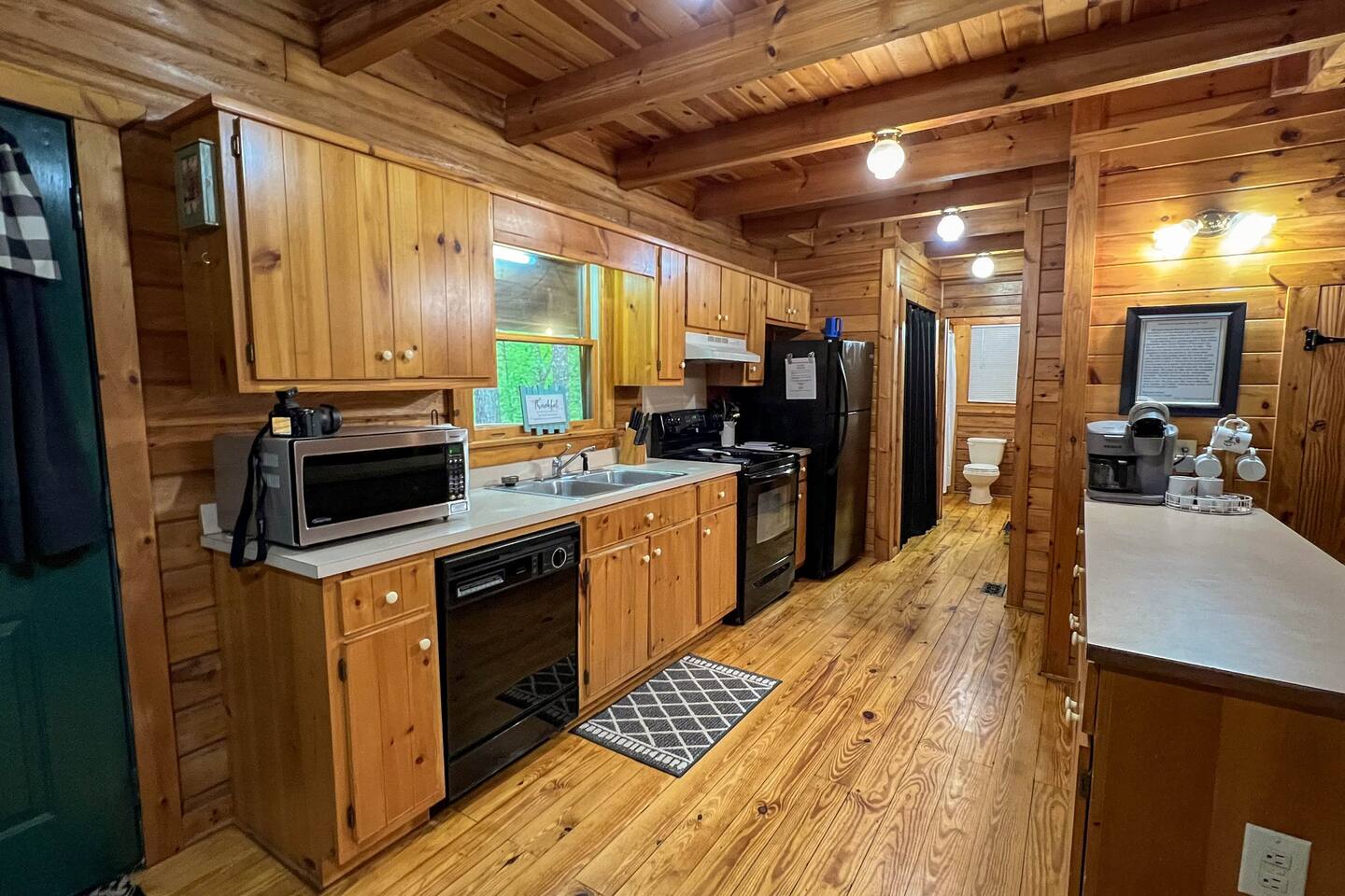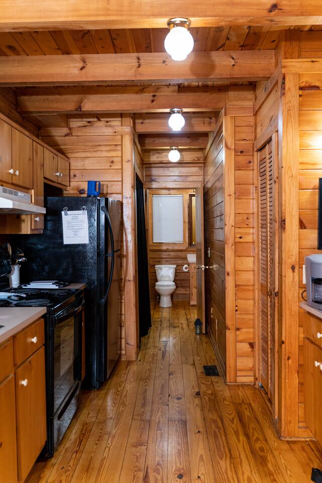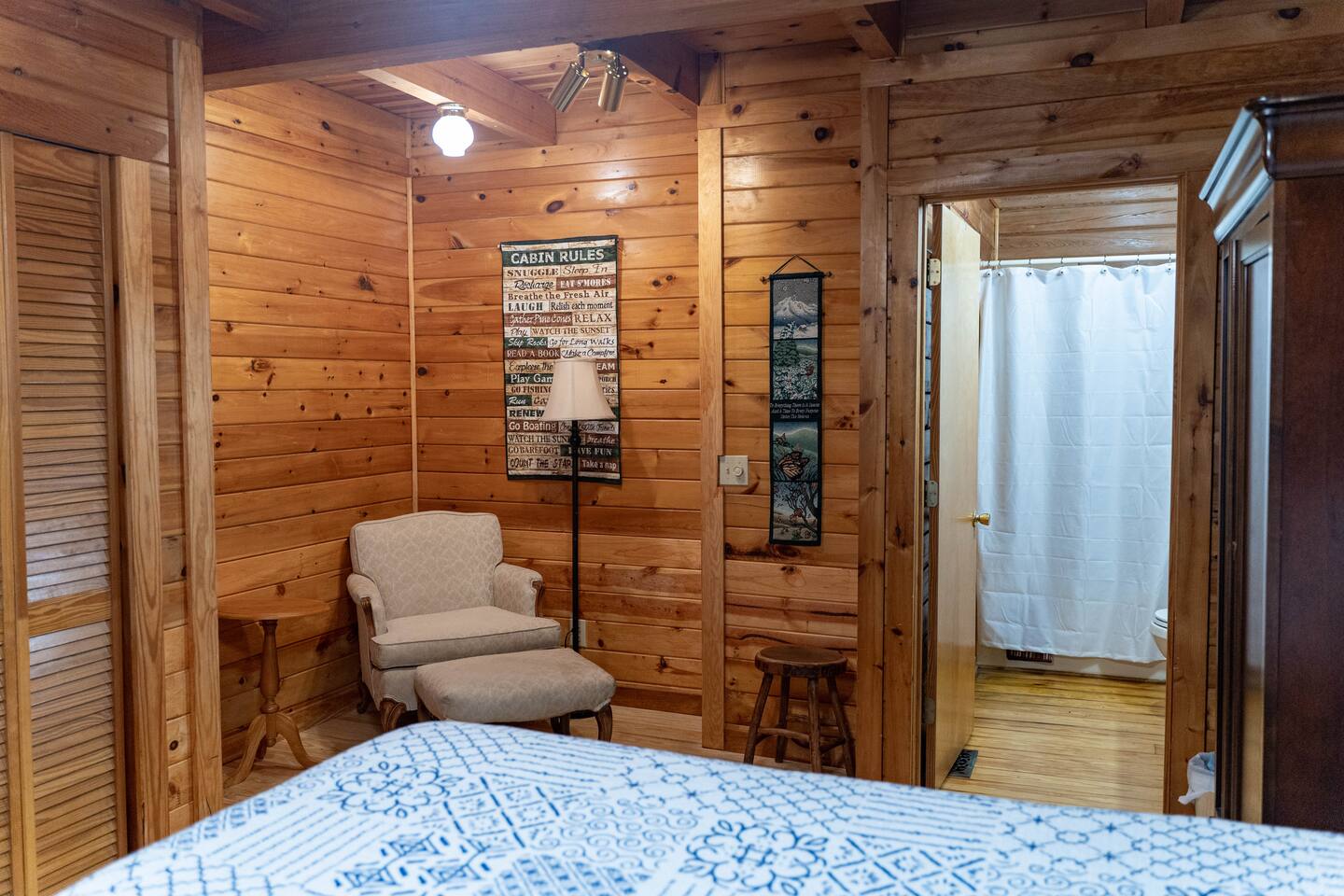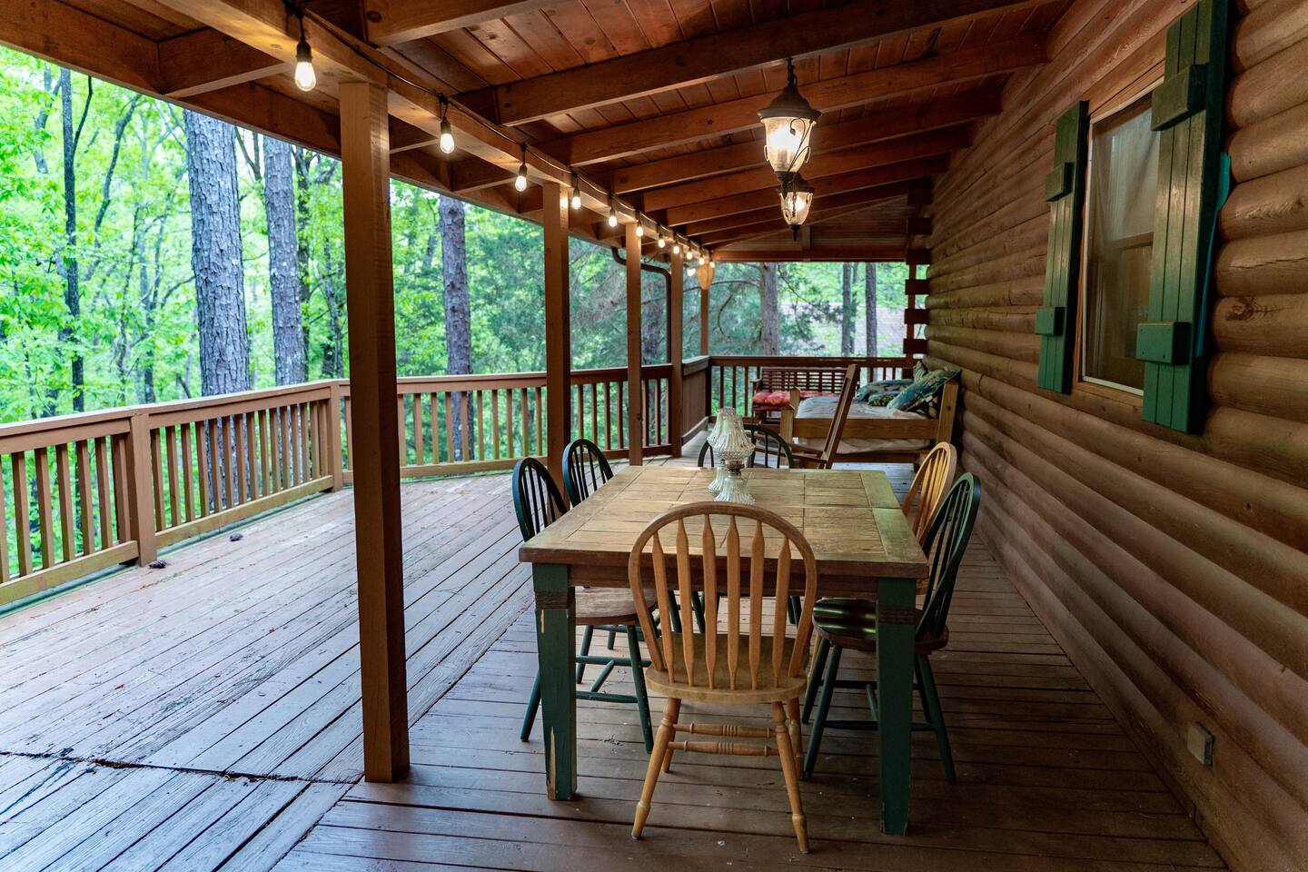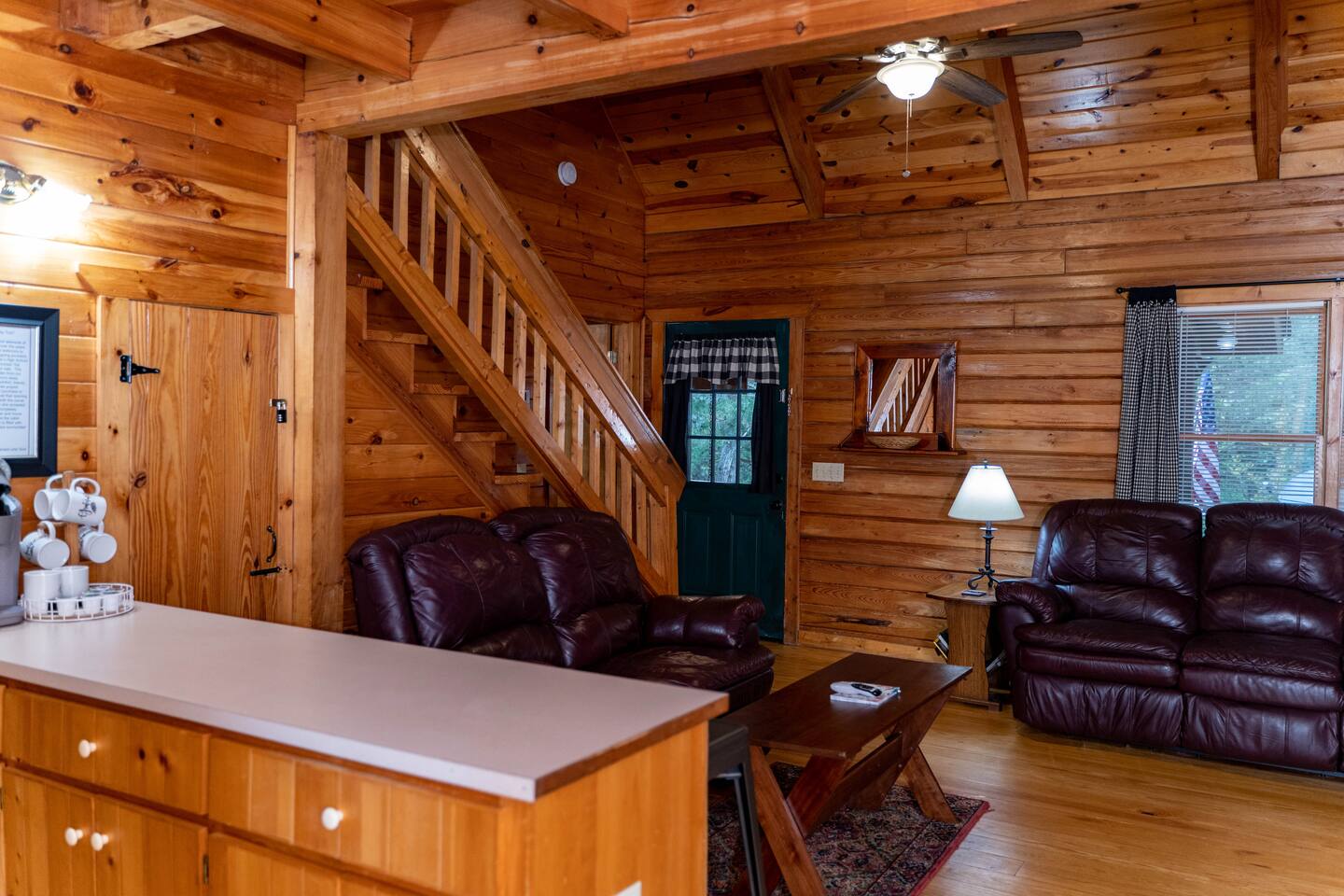 Southern Serenity – Cozy Cabin Retreat in Warm Springs, Georgia -- Escape the hustle and bustle and find your peace at Southern Serenity, a charming cabin tucked away in the serene woodlands of F. D. Roosevelt State Park, just a short drive to Callaway Gardens. Perfect for families, couples, or small groups, this pet-friendly Warm Springs vacation rental comfortably sleeps up to seven guests and offers the ideal blend of rustic charm and modern comfort. The first-floor primary bedroom is furnished with a king bed, cozy sitting nook, large closet, and adjoining bathroom. Upstairs, you’ll find an open loft with a twin-over-full bunk bed, plus a second full bath and a private bedroom with a queen bed. Sip your morning coffee or evening wine on the front porch swings as you relax, or gather on the expansive back deck with outdoor dining space, lounge chairs, and plenty of seating overlooking the peaceful wood scape. Your four-legged friends will love the fenced-in yard where they can safely play while you unwind by the outdoor firepit. Additional amenities include a wood burning fireplace, outdoor grill for cookouts, a Keurig with complimentary K-Cup pods, welcome drinks, basic cooking spices, and all the little touches to make your stay stress-free. Whether you’re here for Pumpkins at Callaway, Festival in Lights, hiking, exploring nearby downtown Pine Mountain or Warm Springs, Southern Serenity is the perfect Georgia mountain getaway to relax, recharge, and reconnect.