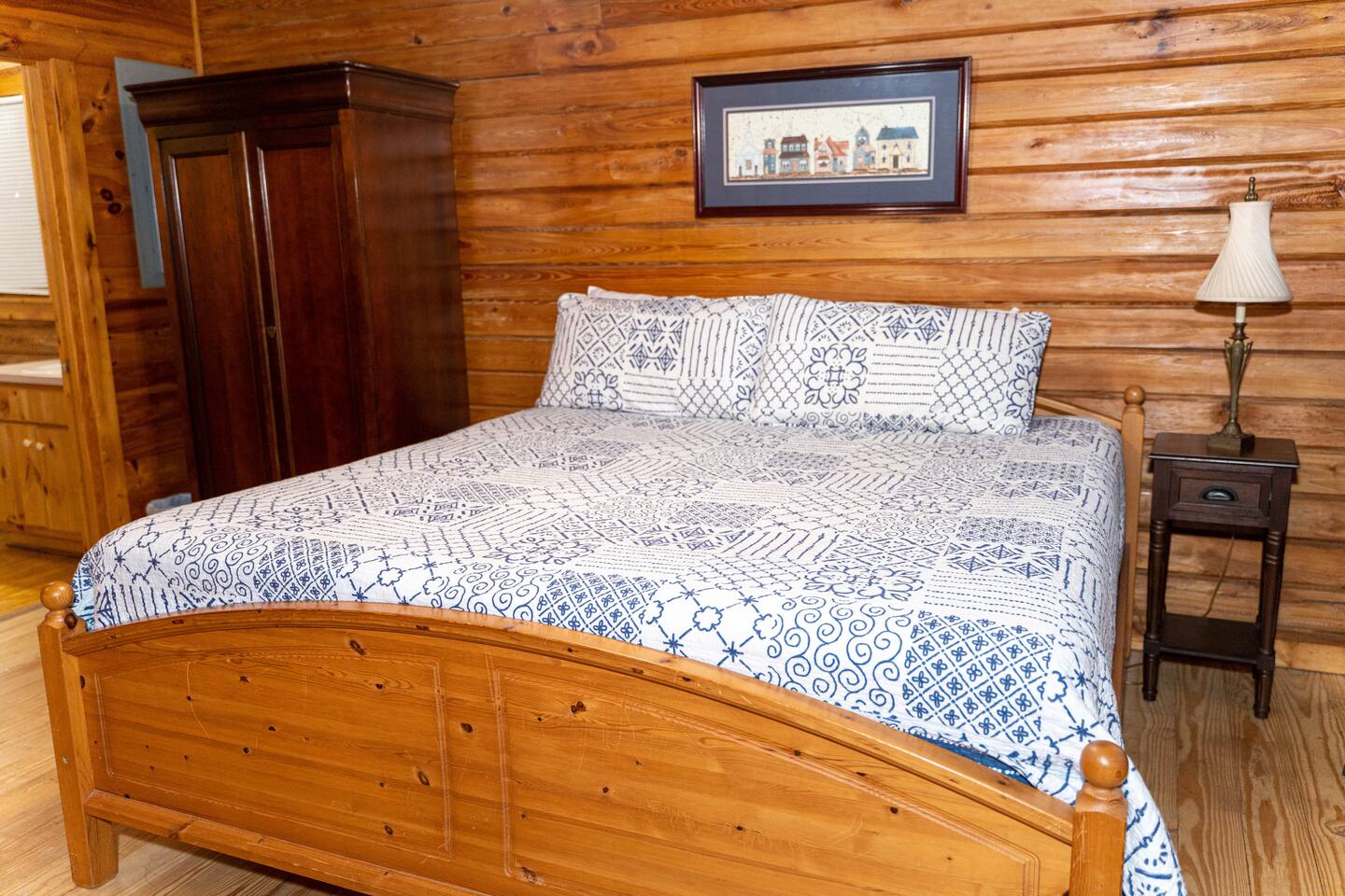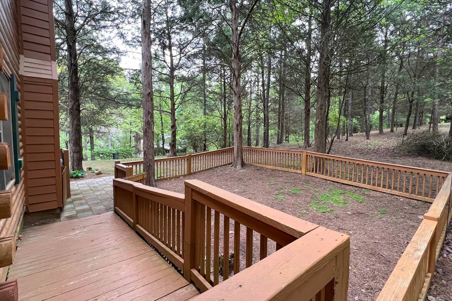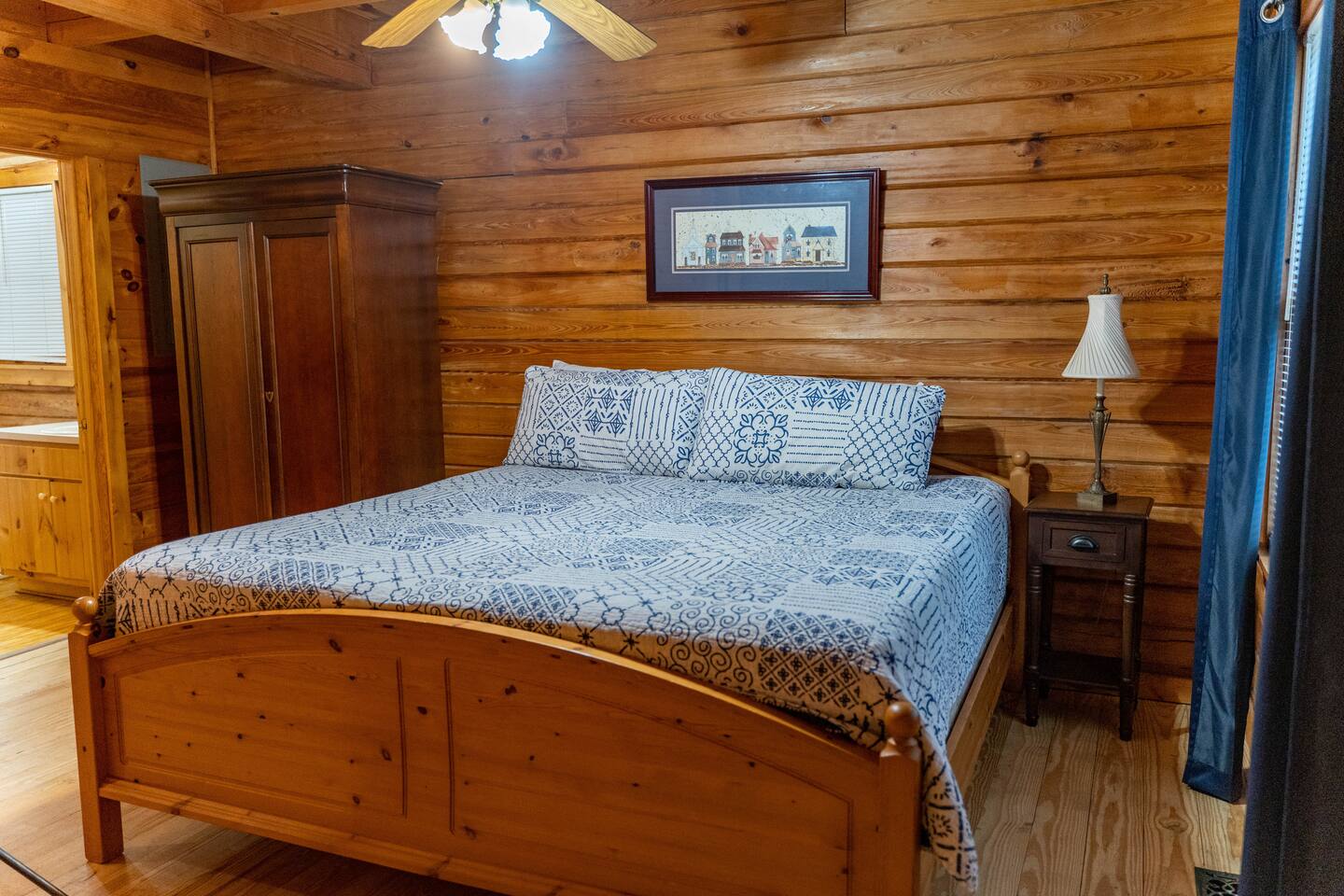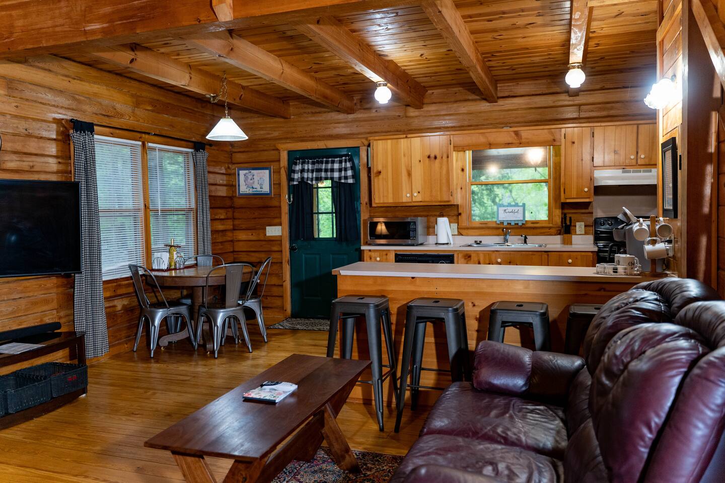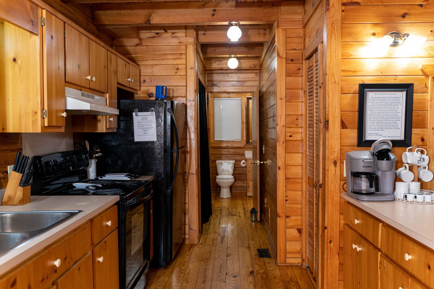 Southern Serenity – Cozy Cabin Retreat in Warm Springs, Georgia -- Escape the hustle and bustle and find your peace at Southern Serenity, a charming cabin tucked away in the serene woodlands of F. D. Roosevelt State Park, just a short drive to Callaway Gardens. Perfect for families, couples, or small groups, this pet-friendly Warm Springs vacation rental comfortably sleeps up to seven guests and offers the ideal blend of rustic charm and modern comfort. The first-floor primary bedroom is furnished with a king bed, cozy sitting nook, large closet, and adjoining bathroom. Upstairs, you’ll find an open loft with a twin-over-full bunk bed, plus a second full bath and a private bedroom with a queen bed. Sip your morning coffee or evening wine on the front porch swings as you relax, or gather on the expansive back deck with outdoor dining space, lounge chairs, and plenty of seating overlooking the peaceful wood scape. Your four-legged friends will love the fenced-in yard where they can safely play while you unwind by the outdoor firepit. Additional amenities include a wood burning fireplace, outdoor grill for cookouts, a Keurig with complimentary K-Cup pods, welcome drinks, basic cooking spices, and all the little touches to make your stay stress-free. Whether you’re here for Pumpkins at Callaway, Festival in Lights, hiking, exploring nearby downtown Pine Mountain or Warm Springs, Southern Serenity is the perfect Georgia mountain getaway to relax, recharge, and reconnect.
