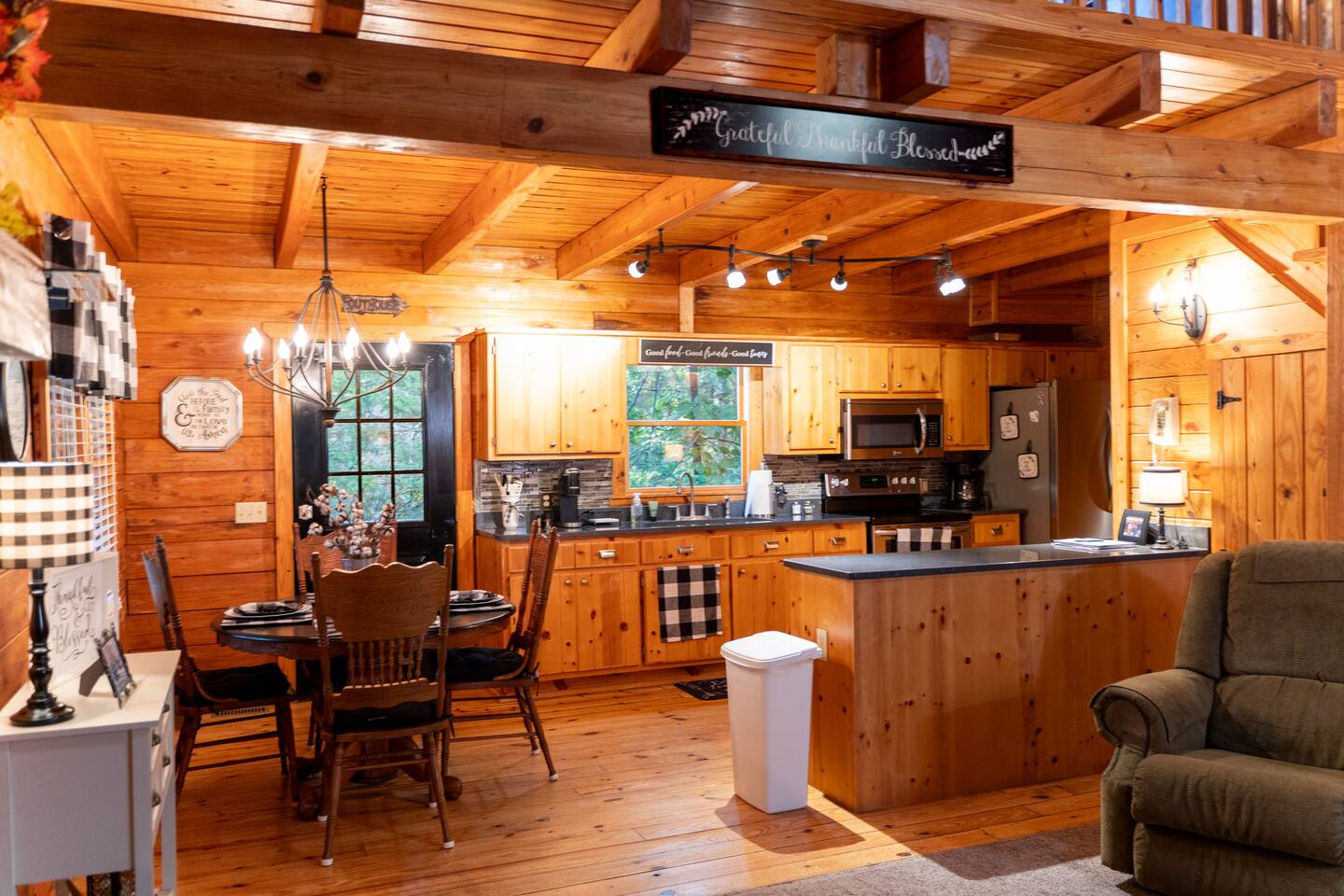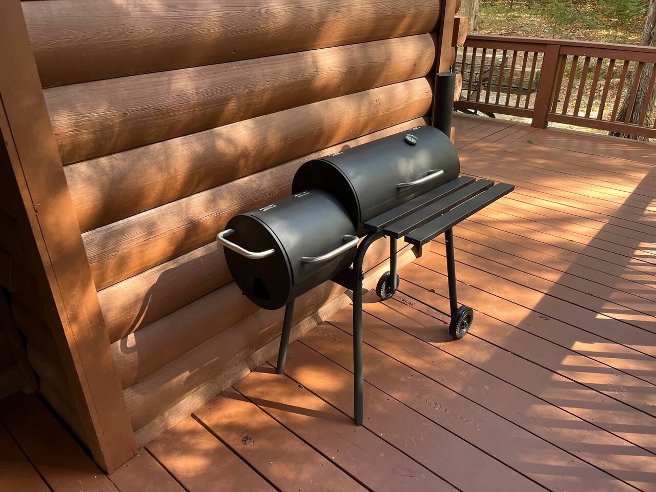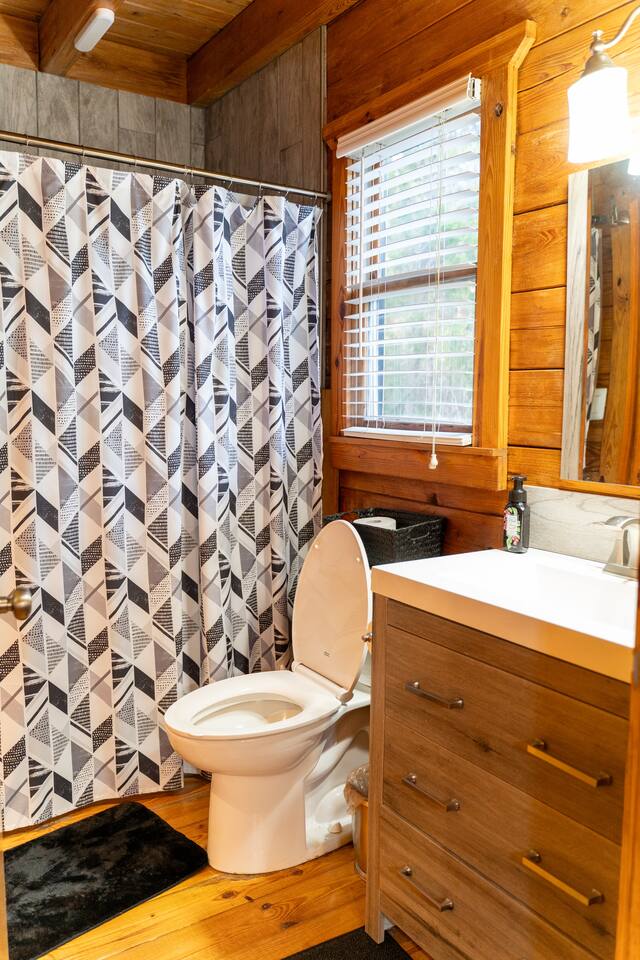 Relax with the whole family at this peaceful place to stay.This beautifully remodeled cabin offers two bedrooms and two full baths, fully equipped kitchen with KEURIG. Located in a picturesque setting, perfect for enjoying a quiet evening on the front porch, or grilling on the charcoal grill and smoker. We are a pet friendly cabin with High Speed Fiber Internet! A queen size bed, a double bed, along with two full beds in the loft make this cabin perfect for a family or friends.