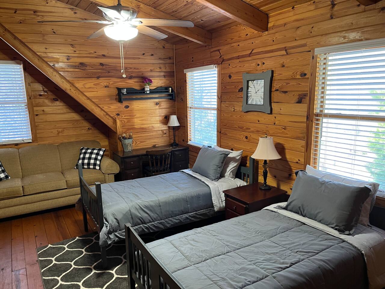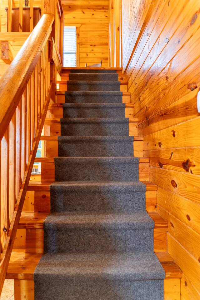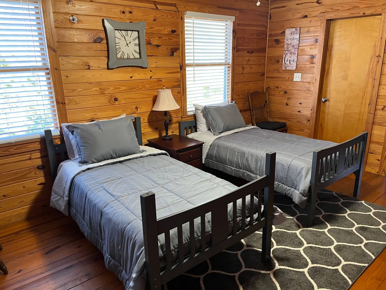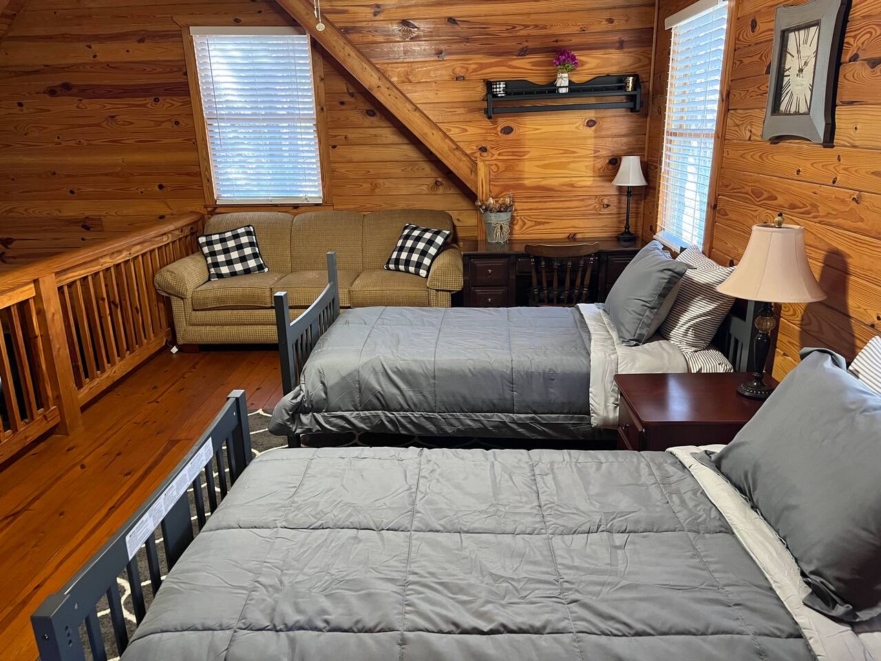 Relax with the whole family at this peaceful place to stay.This beautifully remodeled cabin offers two bedrooms and two full baths, fully equipped kitchen with KEURIG. Located in a picturesque setting, perfect for enjoying a quiet evening on the front porch, or grilling on the charcoal grill and smoker. We are a pet friendly cabin with High Speed Fiber Internet! A queen size bed, a double bed, along with two full beds in the loft make this cabin perfect for a family or friends.