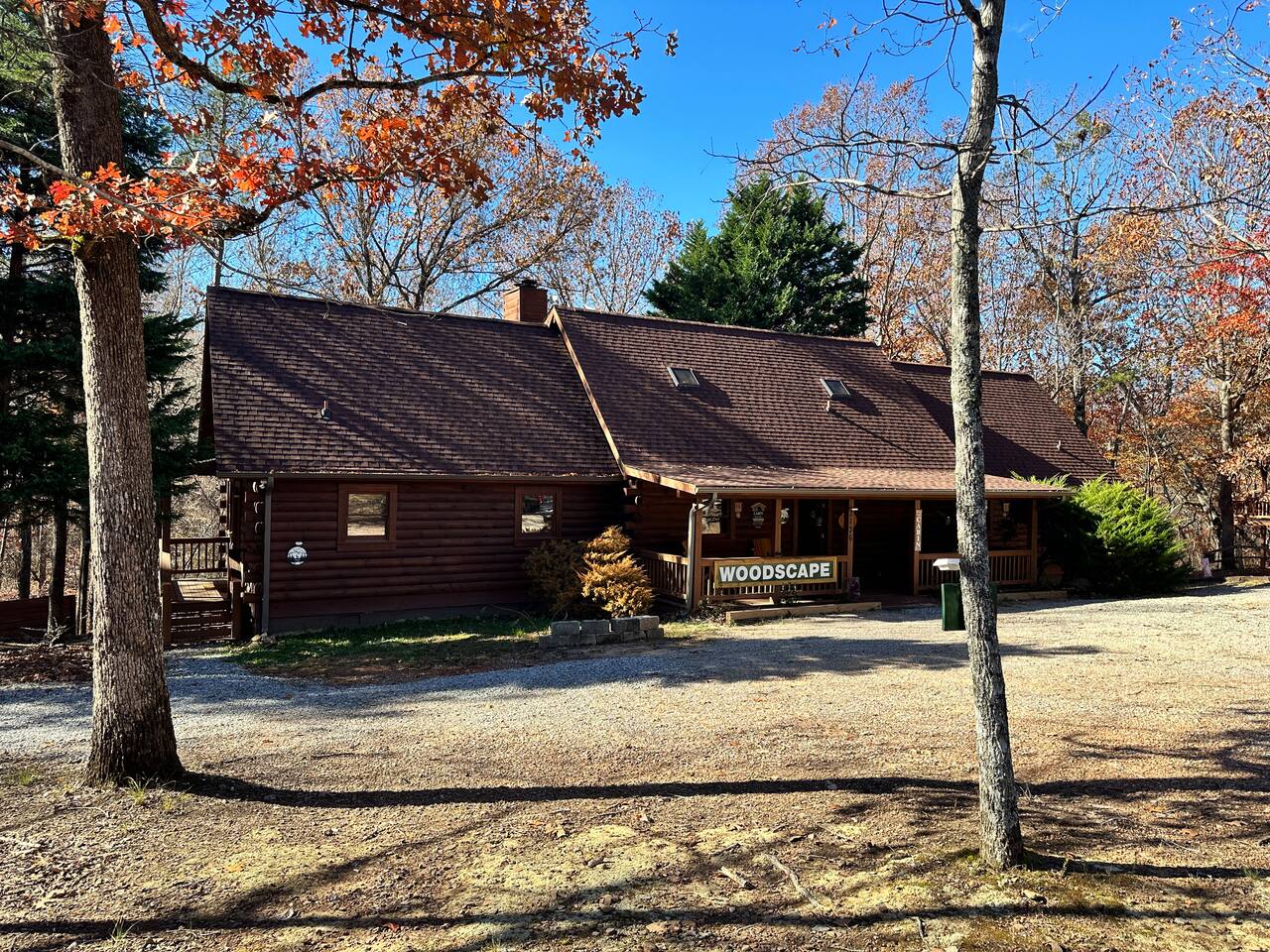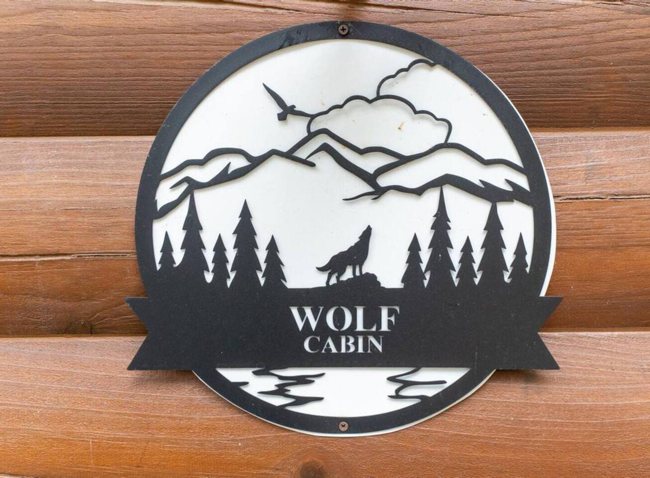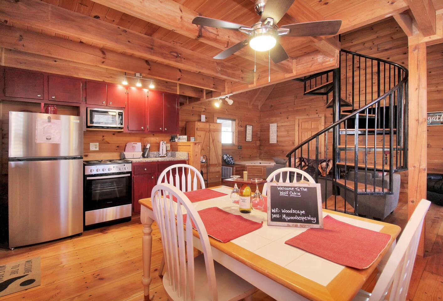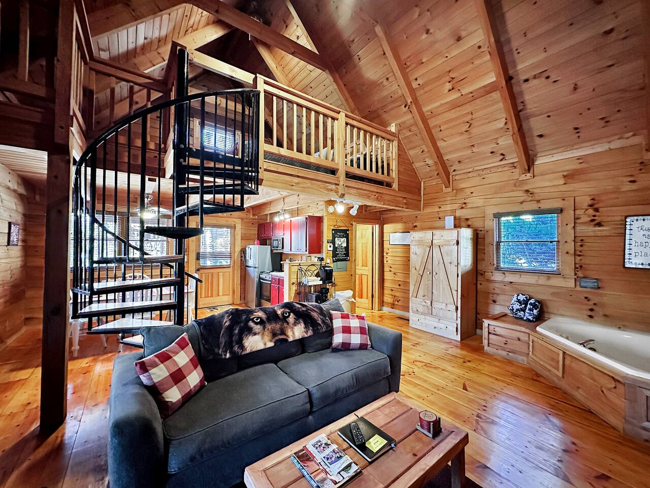 Right end of triplex, Wolf has gorgeous pine flooring, modern upgrades and a great cabin feel. Relax outside on the porch swing, in the gazebo, or around the fire pit with a glass of complementary wine & Coffee or maybe you’d rather relax inside? With a fully stocked modern kitchen, private indoor jacuzzi and Queen-sized log bed, as well as a queen size sleeper sofa. Come play, cook, and rest in comfort. Streaming TV, High speed internet and ATT landline. Woodscape truly is the perfect getaway.