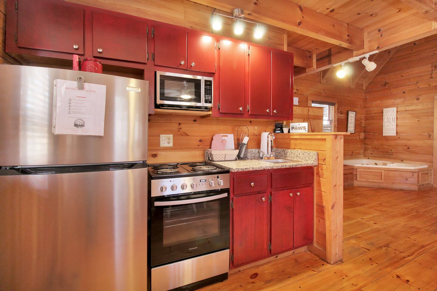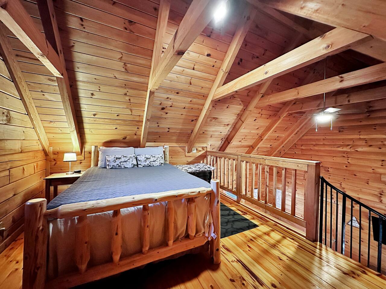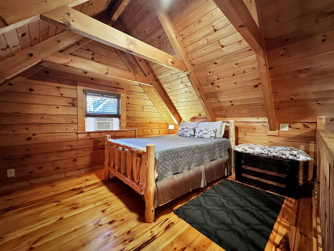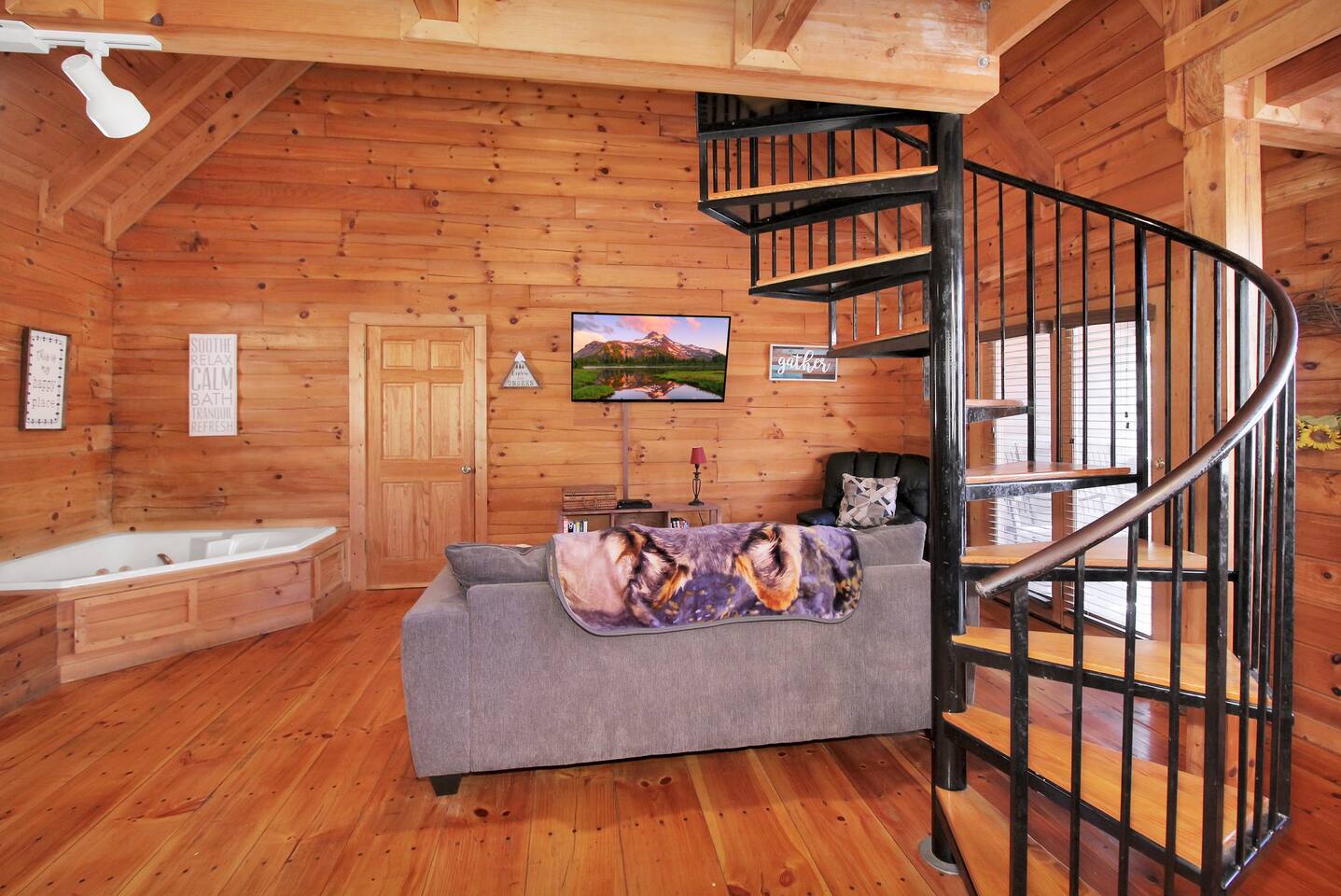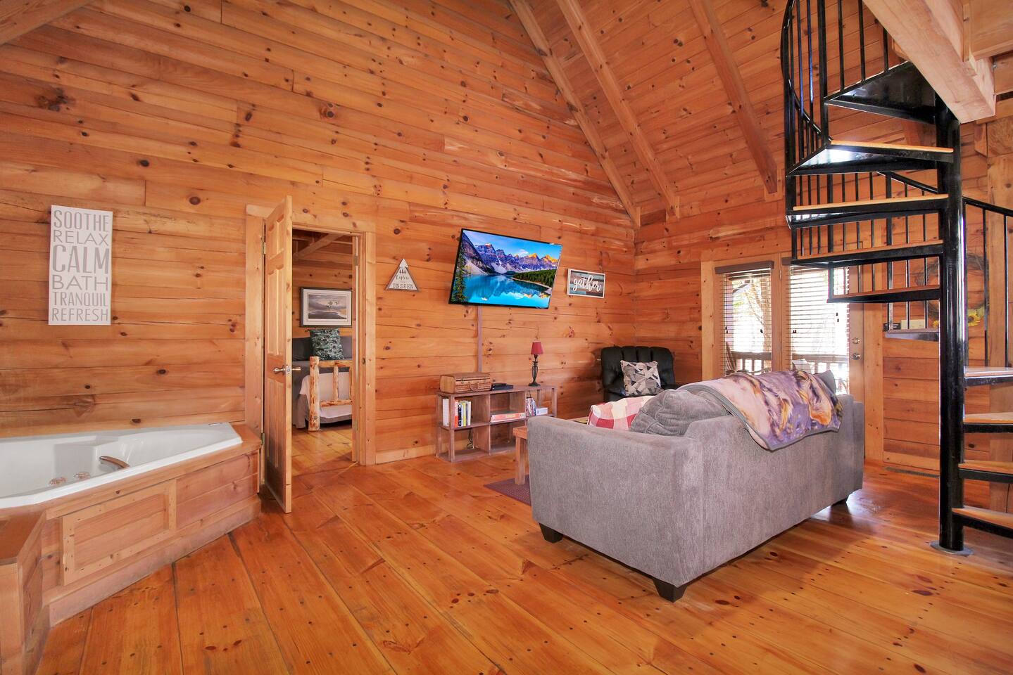 Right end of triplex, Wolf has gorgeous pine flooring, modern upgrades and a great cabin feel. Relax outside on the porch swing, in the gazebo, or around the fire pit with a glass of complementary wine & Coffee or maybe you’d rather relax inside? With a fully stocked modern kitchen, private indoor jacuzzi and Queen-sized log bed, as well as a queen size sleeper sofa. Come play, cook, and rest in comfort. Streaming TV, High speed internet and ATT landline. Woodscape truly is the perfect getaway.