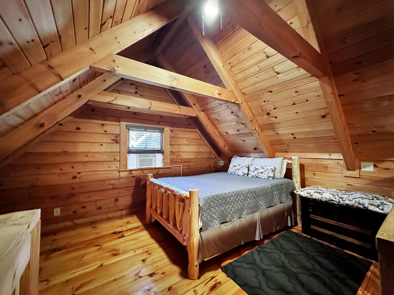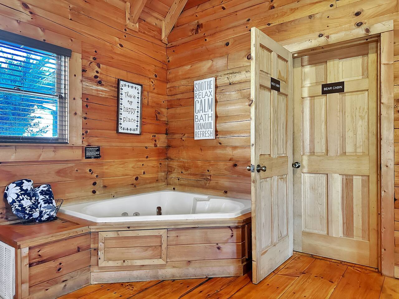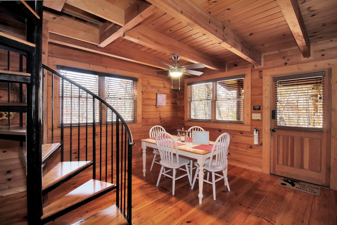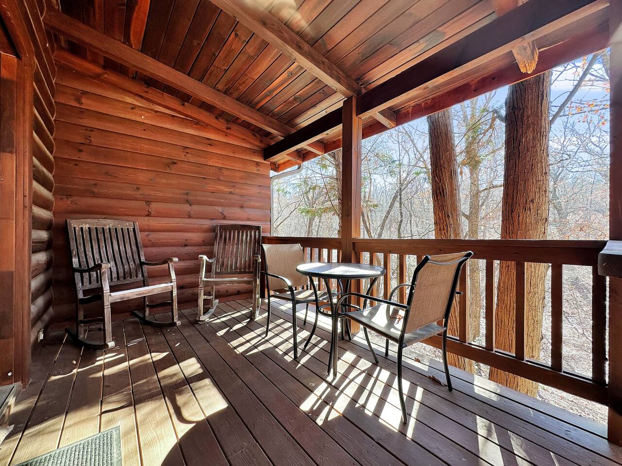 Right end of triplex, Wolf has gorgeous pine flooring, modern upgrades and a great cabin feel. Relax outside on the porch swing, in the gazebo, or around the fire pit with a glass of complementary wine & Coffee or maybe you’d rather relax inside? With a fully stocked modern kitchen, private indoor jacuzzi and Queen-sized log bed, as well as a queen size sleeper sofa. Come play, cook, and rest in comfort. Streaming TV, High speed internet and ATT landline. Woodscape truly is the perfect getaway.