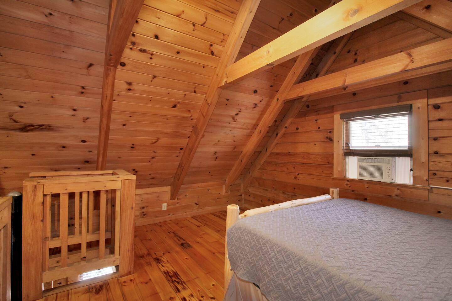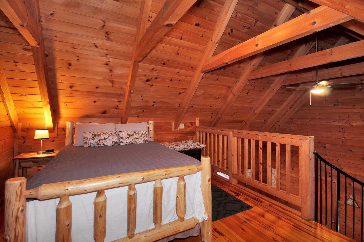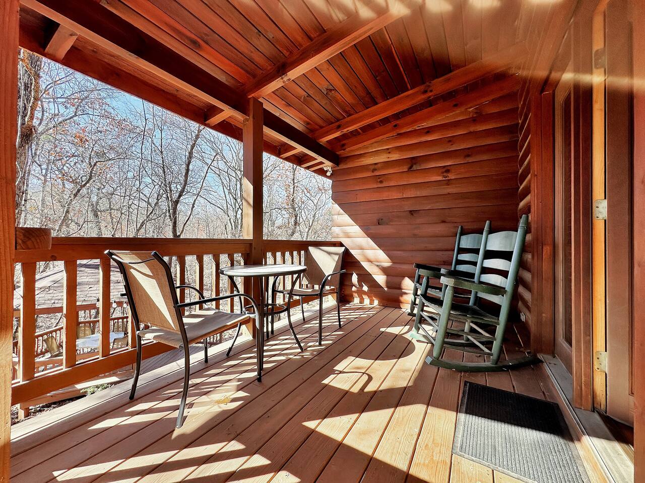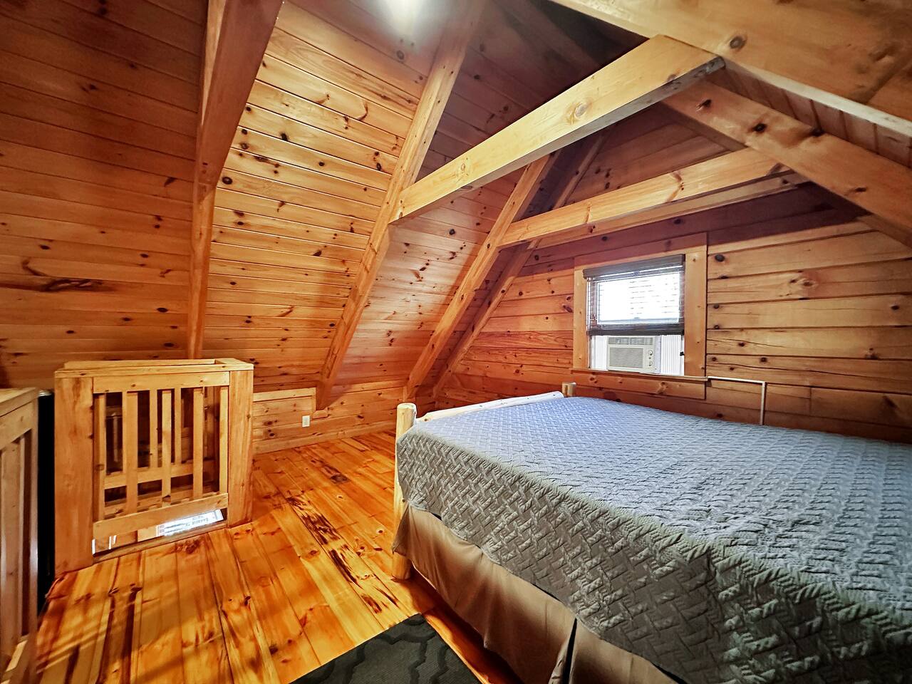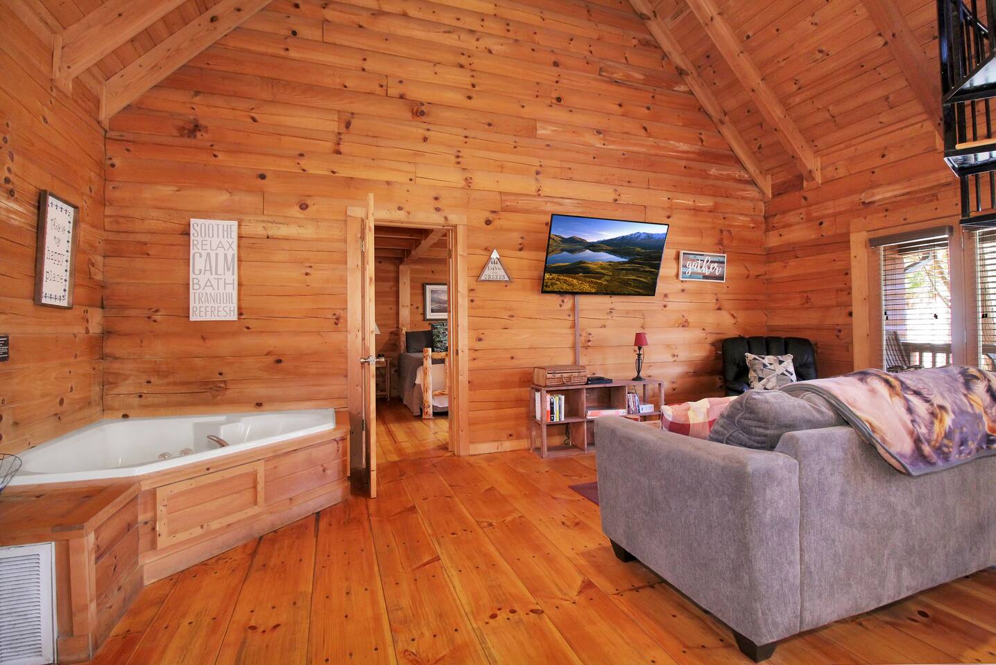 Right end of triplex, Wolf has gorgeous pine flooring, modern upgrades and a great cabin feel. Relax outside on the porch swing, in the gazebo, or around the fire pit with a glass of complementary wine & Coffee or maybe you’d rather relax inside? With a fully stocked modern kitchen, private indoor jacuzzi and Queen-sized log bed, as well as a queen size sleeper sofa. Come play, cook, and rest in comfort. Streaming TV, High speed internet and ATT landline. Woodscape truly is the perfect getaway.