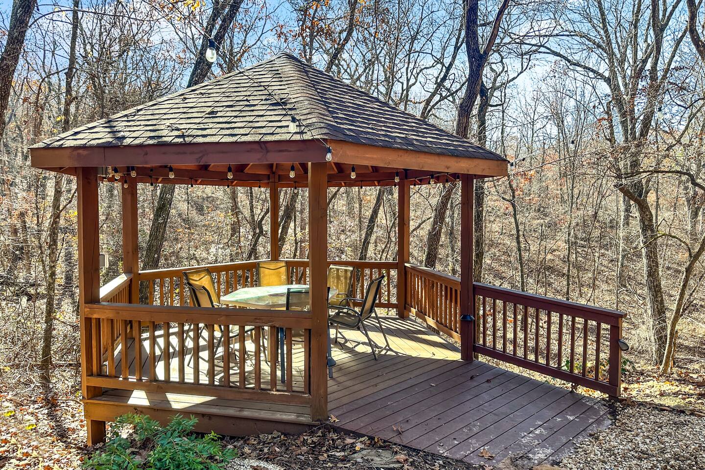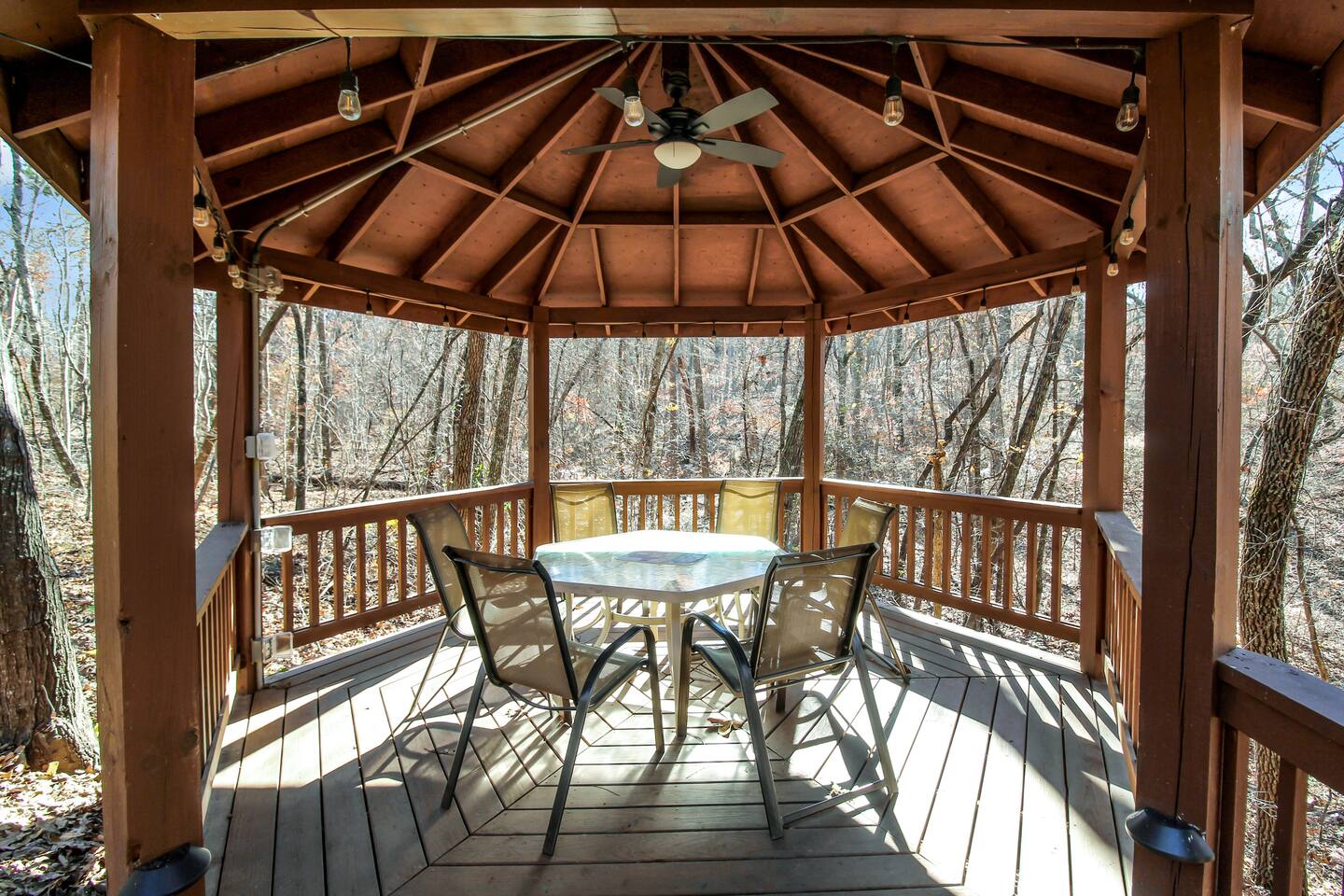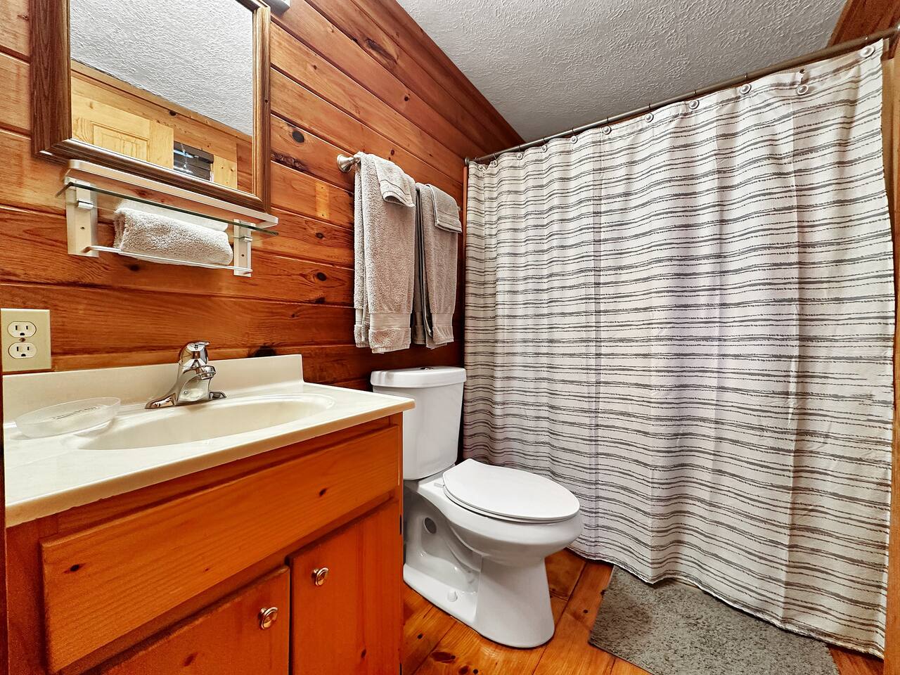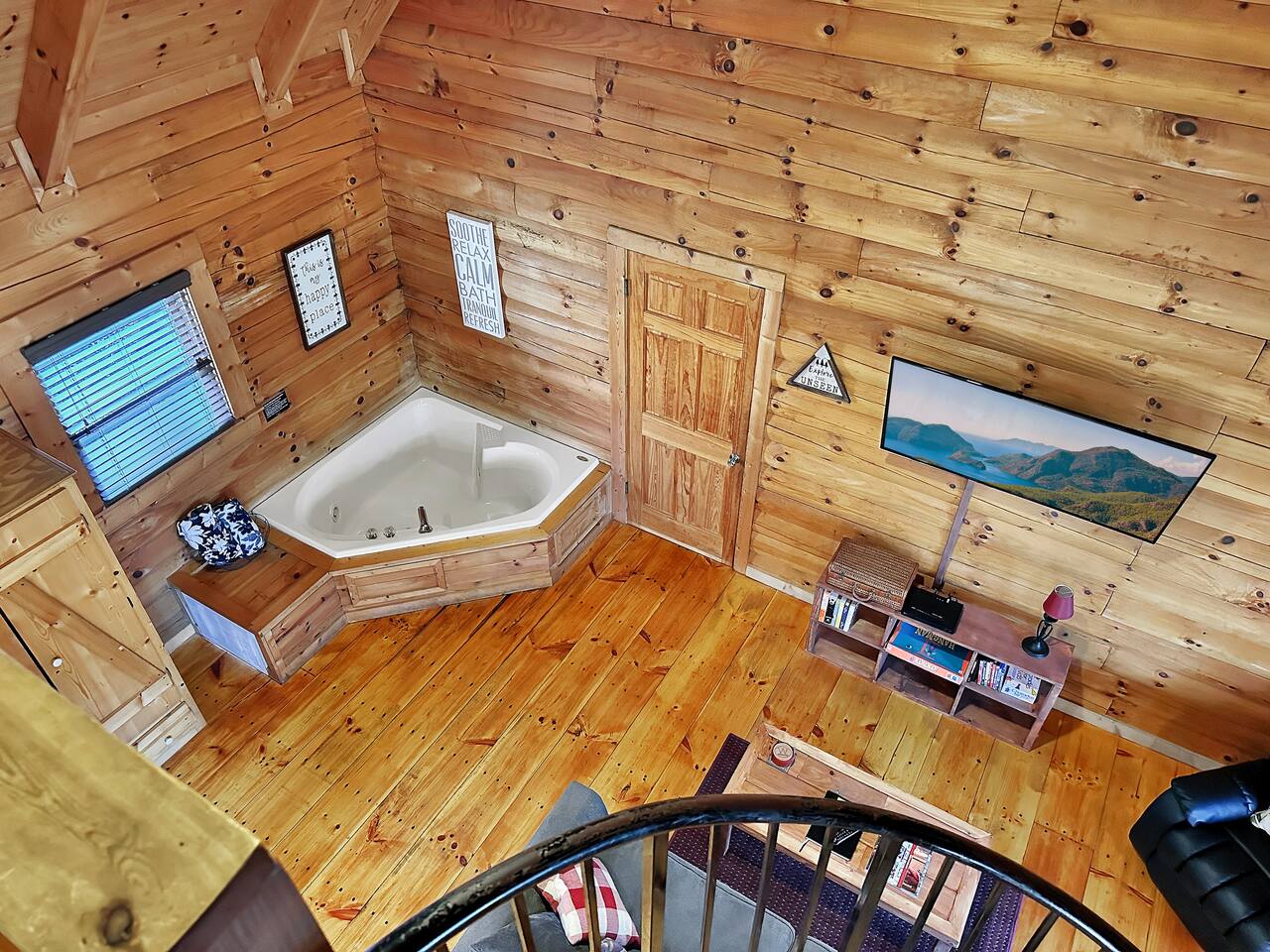 Right end of triplex, Wolf has gorgeous pine flooring, modern upgrades and a great cabin feel. Relax outside on the porch swing, in the gazebo, or around the fire pit with a glass of complementary wine & Coffee or maybe you’d rather relax inside? With a fully stocked modern kitchen, private indoor jacuzzi and Queen-sized log bed, as well as a queen size sleeper sofa. Come play, cook, and rest in comfort. Streaming TV, High speed internet and ATT landline. Woodscape truly is the perfect getaway.